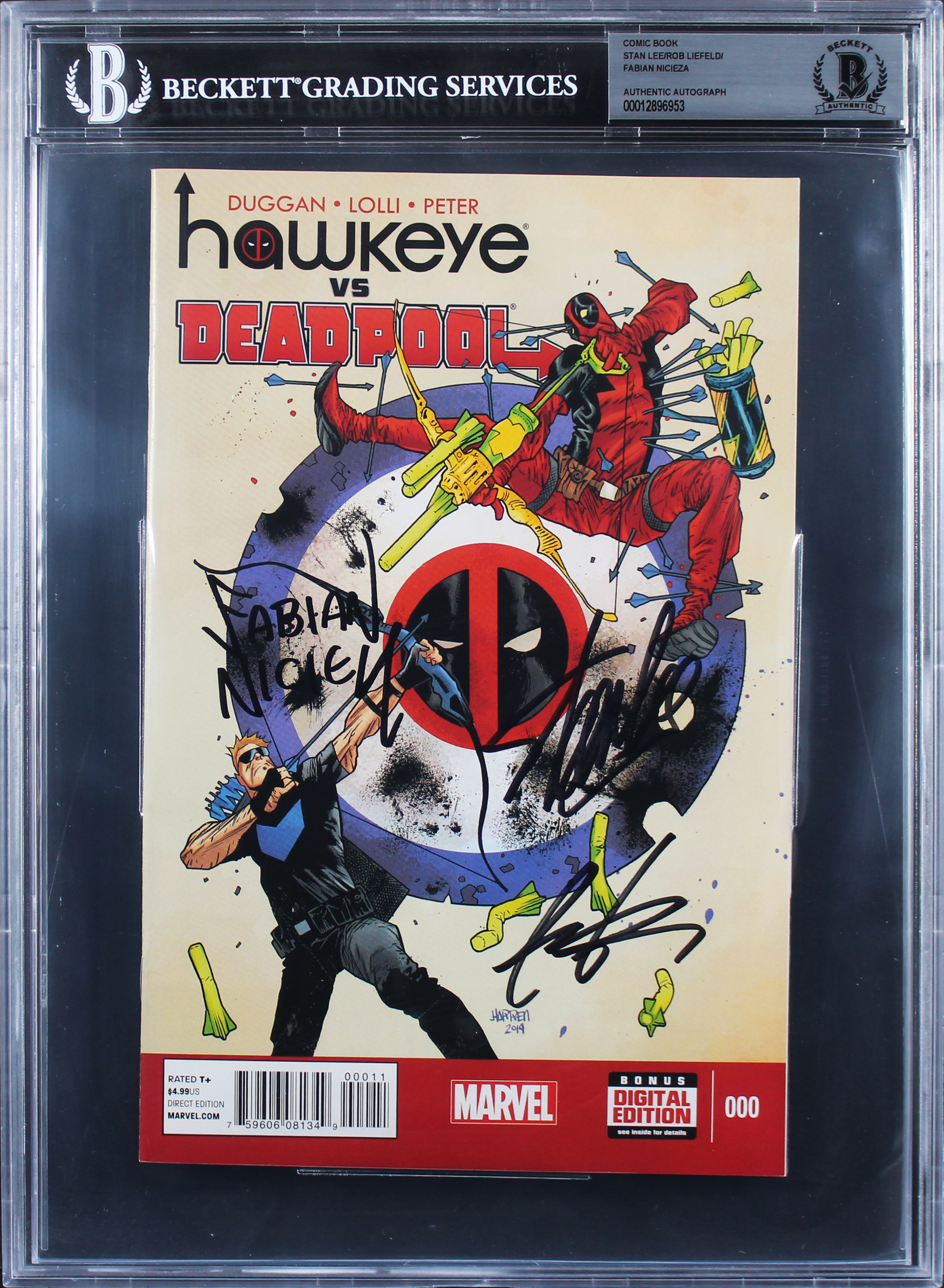(3) Stan Lee, Liefeld & Nicieza Marvel Signed Hawkeye Vs Deadpool Comic BAS Slab