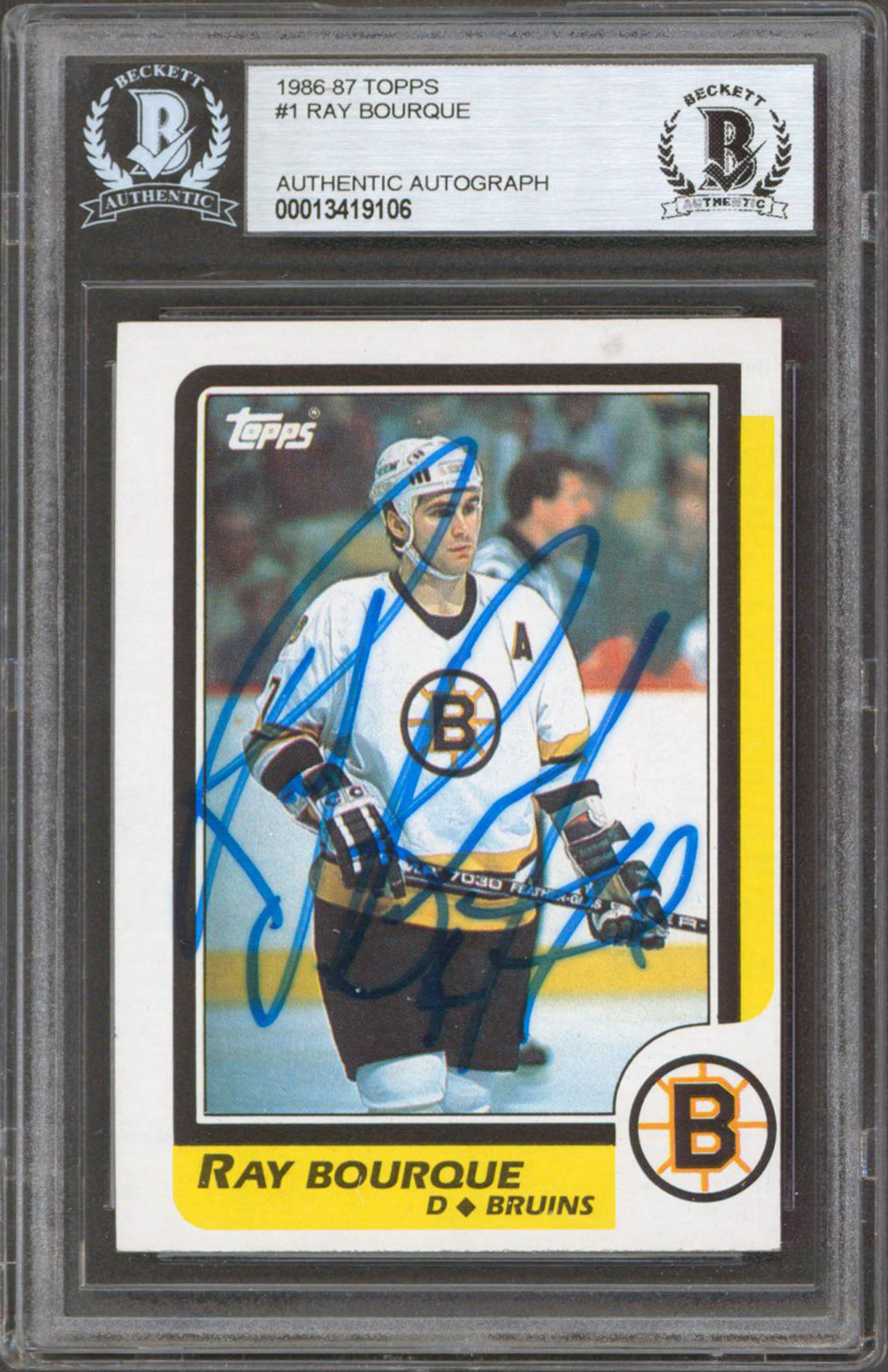 Bruins Ray Bourque Authentic Signed 1986 Topps #1 Card Autographed BAS Slabbed