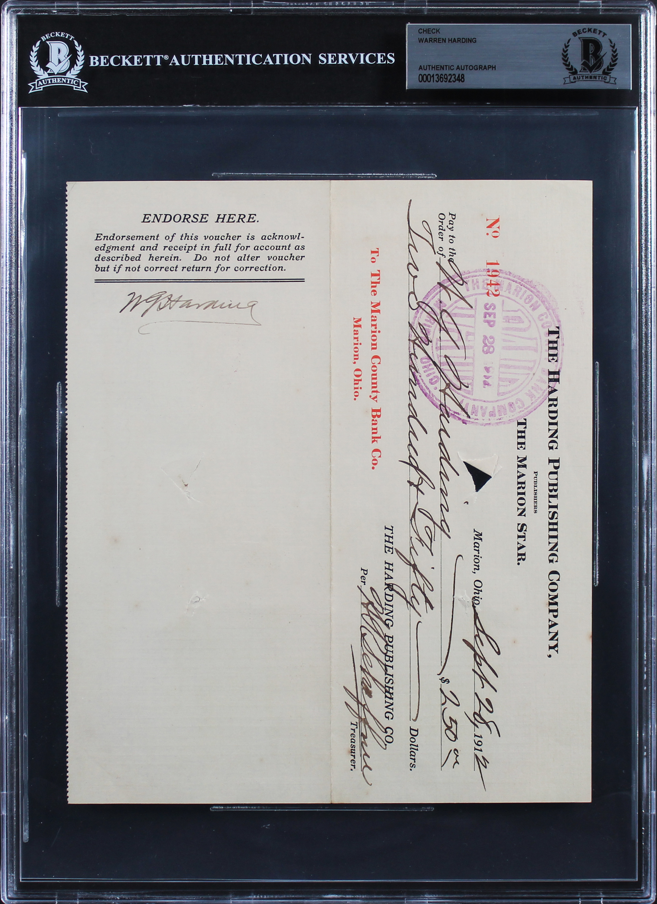 Warren G. Harding Signed 7x8.25 Check Dated September 28, 1912 BAS Slabbed