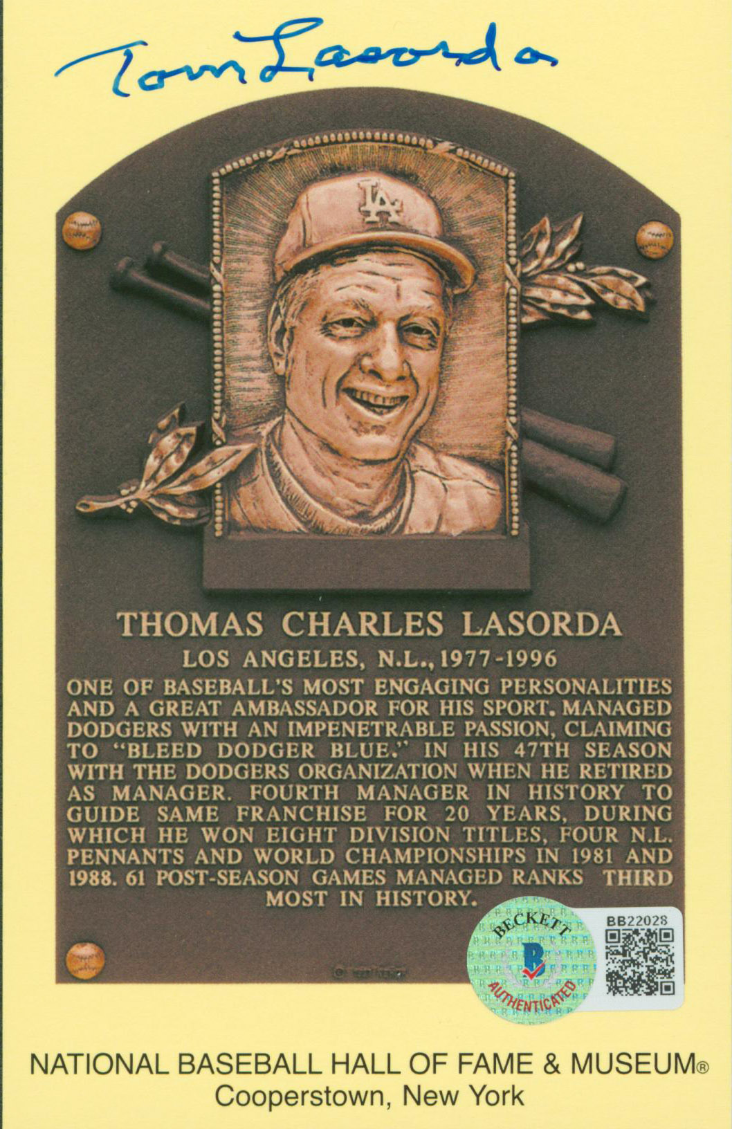 Dodgers Tom Lasorda Authentic Signed 3.5x5.5 Artvue HOF Plaque Postcard BAS
