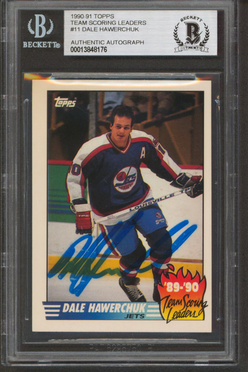 Jets Dale Hawerchuk Signed 1990 Topps Team Scoring Leaders #11 Card BAS Slabbed