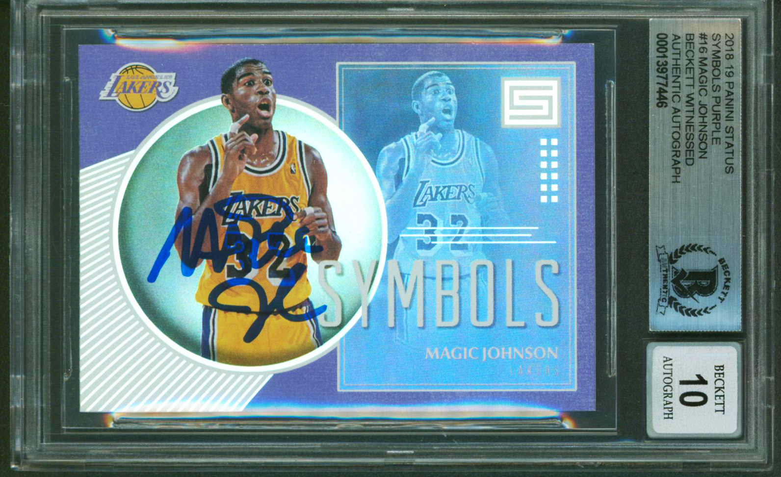 Magic Johnson Signed 2018 Panini Status Symbols Purple #16 Card Auto 10 BAS Slab