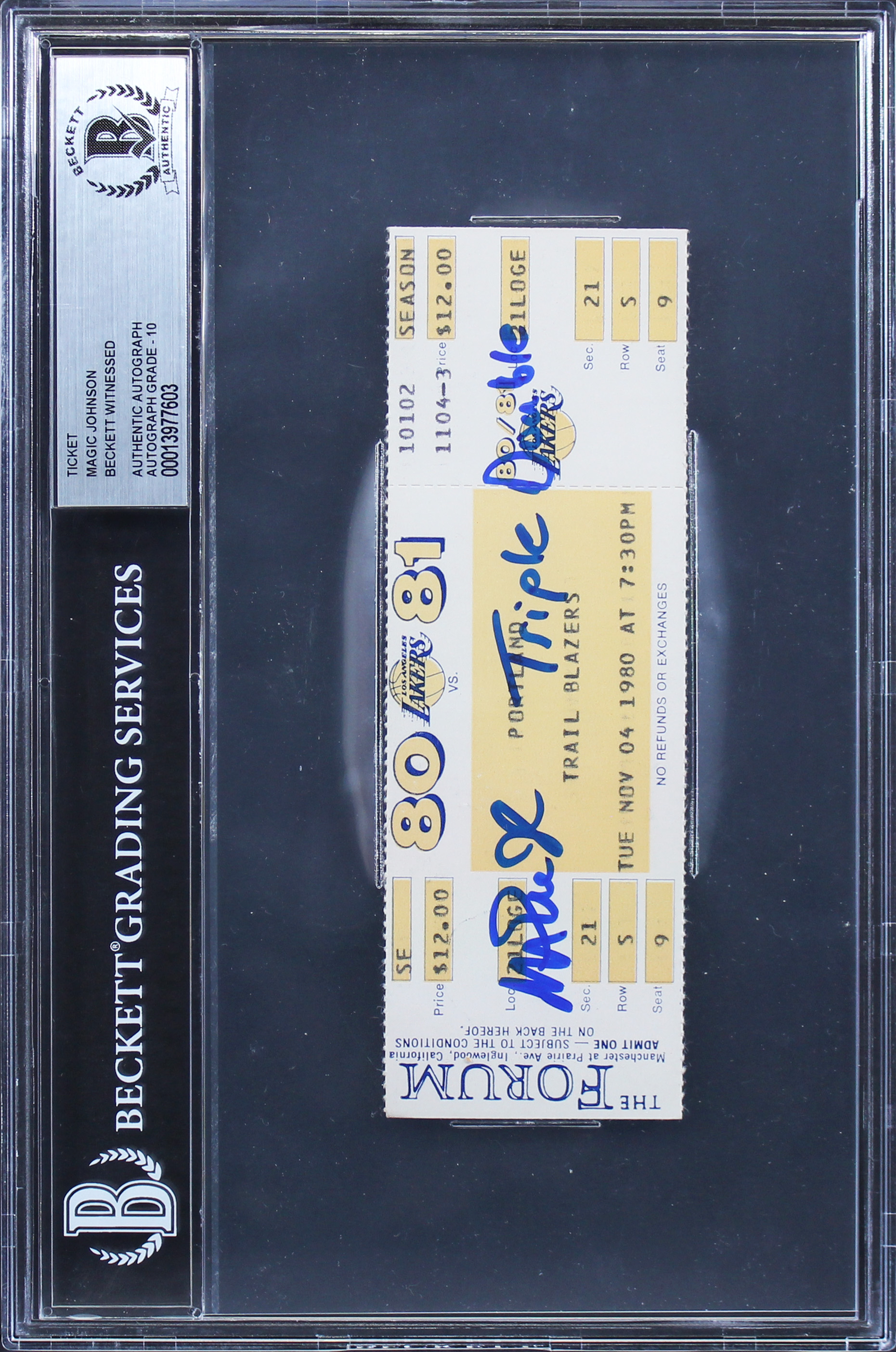 Lakers Magic Johnson Triple Double Signed 1980 Ticket Stub Auto 10! BAS Slabbed