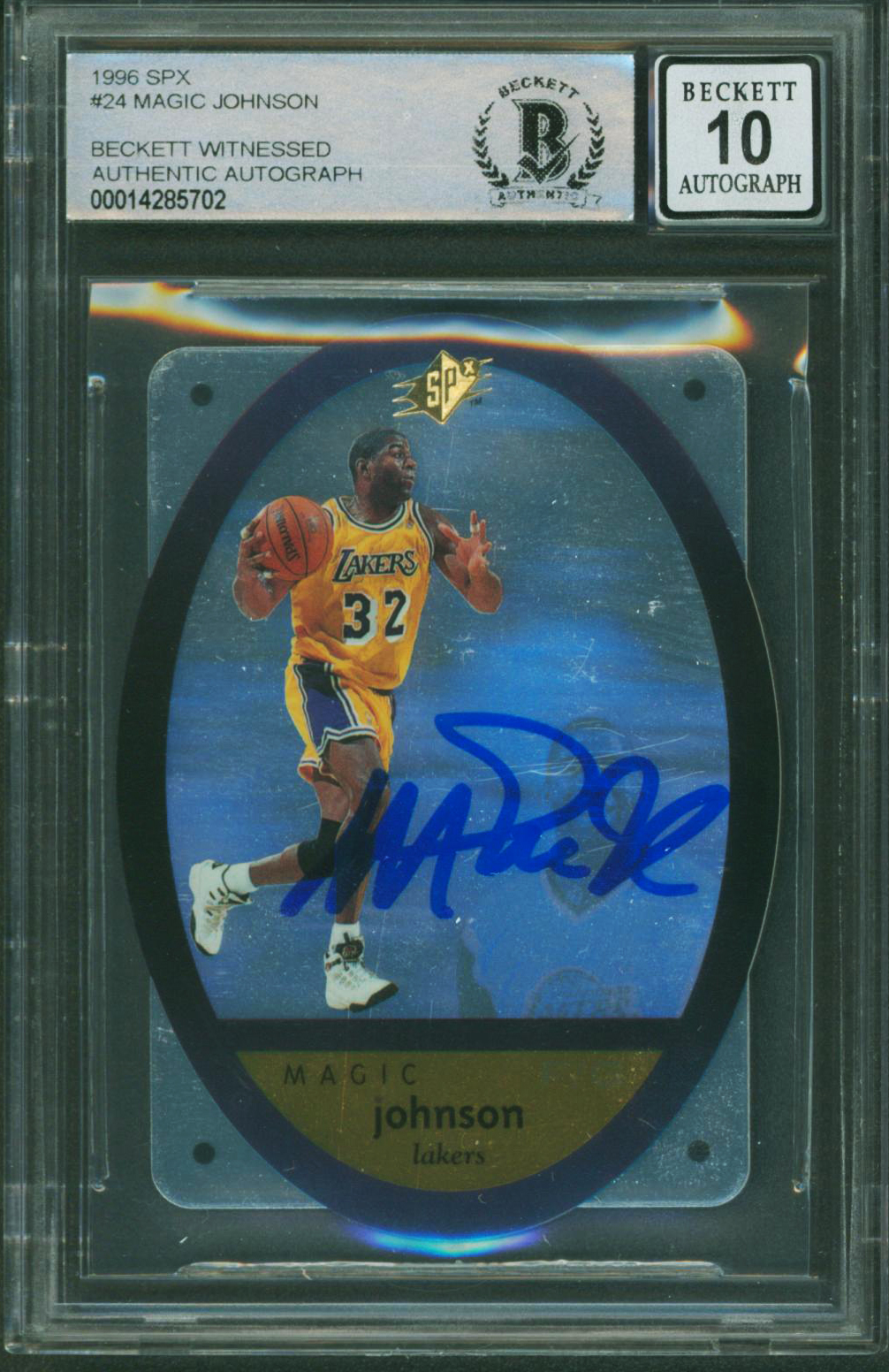 Lakers Magic Johnson Signed 1996 SPX #24 Card Auto 10! w/ Blue Sig BAS Slabbed