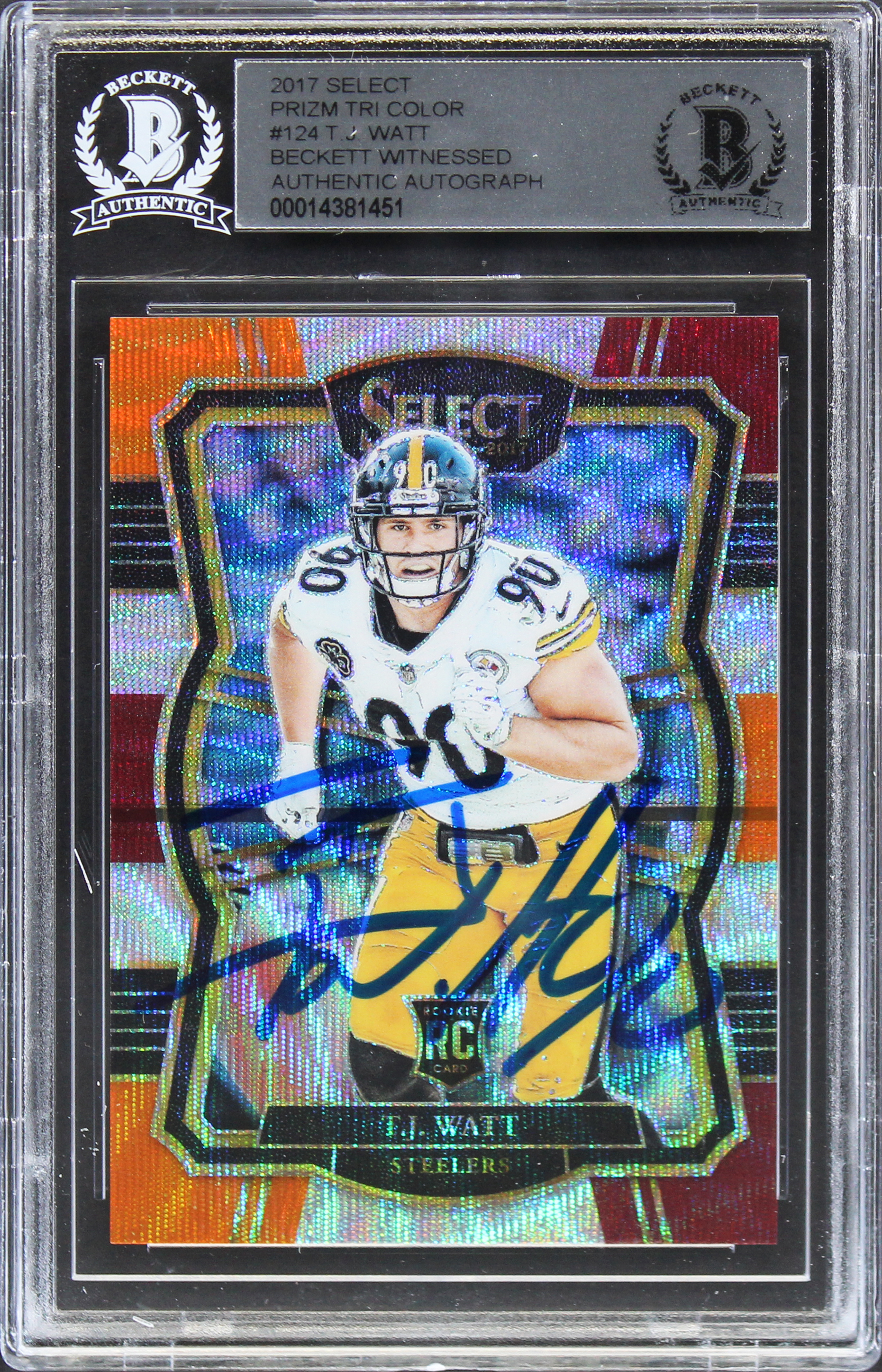 Steelers T.J. Watt Signed 2017 Select Prizm Tri Color #124 Rookie Card BAS Slab
