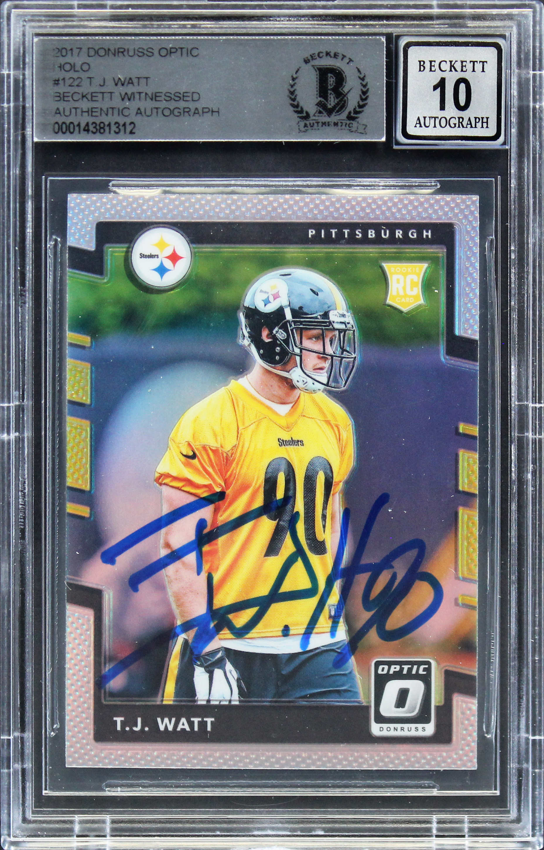 Steelers T.J. Watt Signed 2017 Donruss Optic Holo #122 RC Card Auto 10! BAS Slab