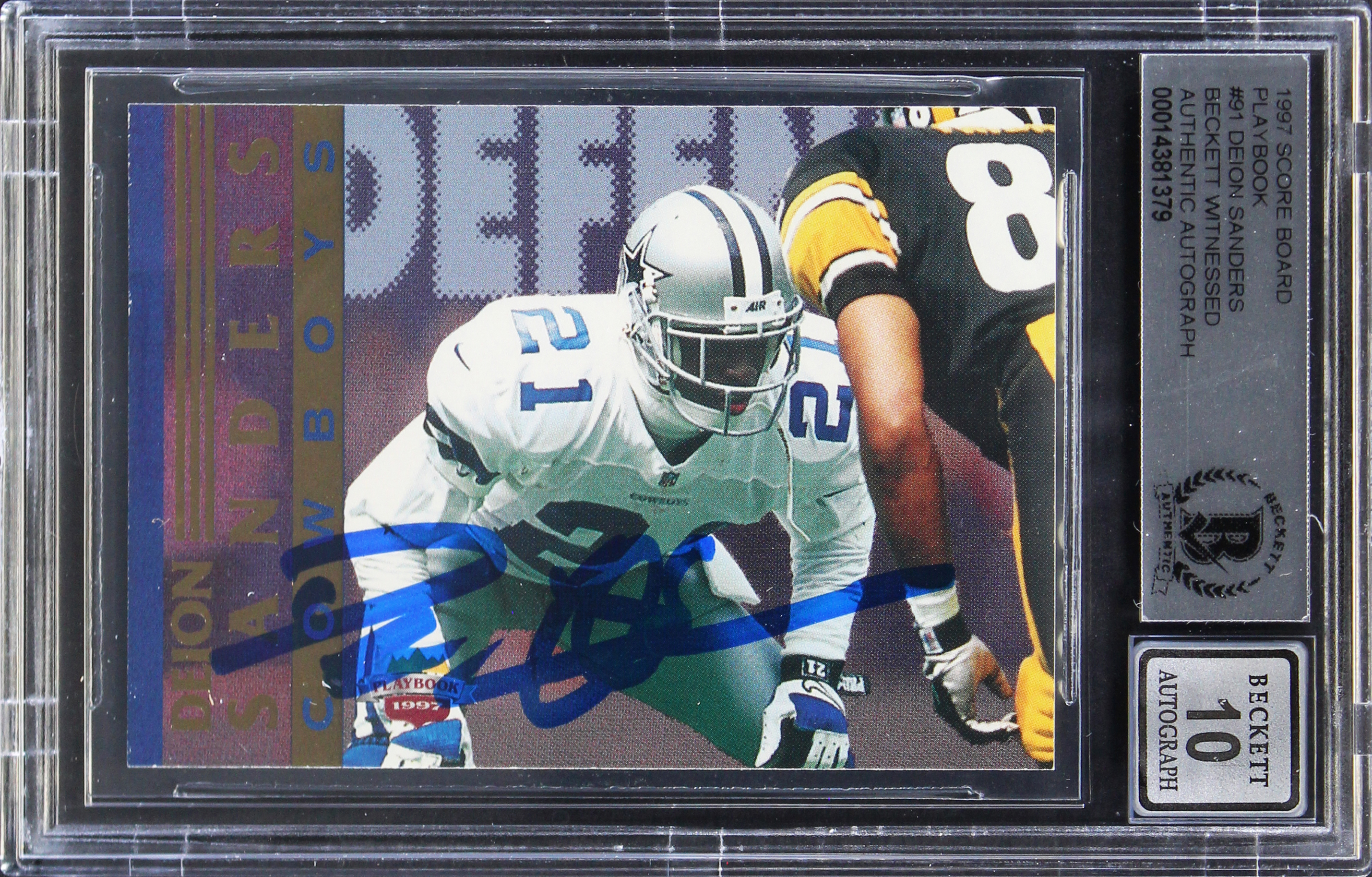 Cowboys Deion Sanders Signed 1997 Score Board Playbook #91 Card Auto 10 BAS Slab