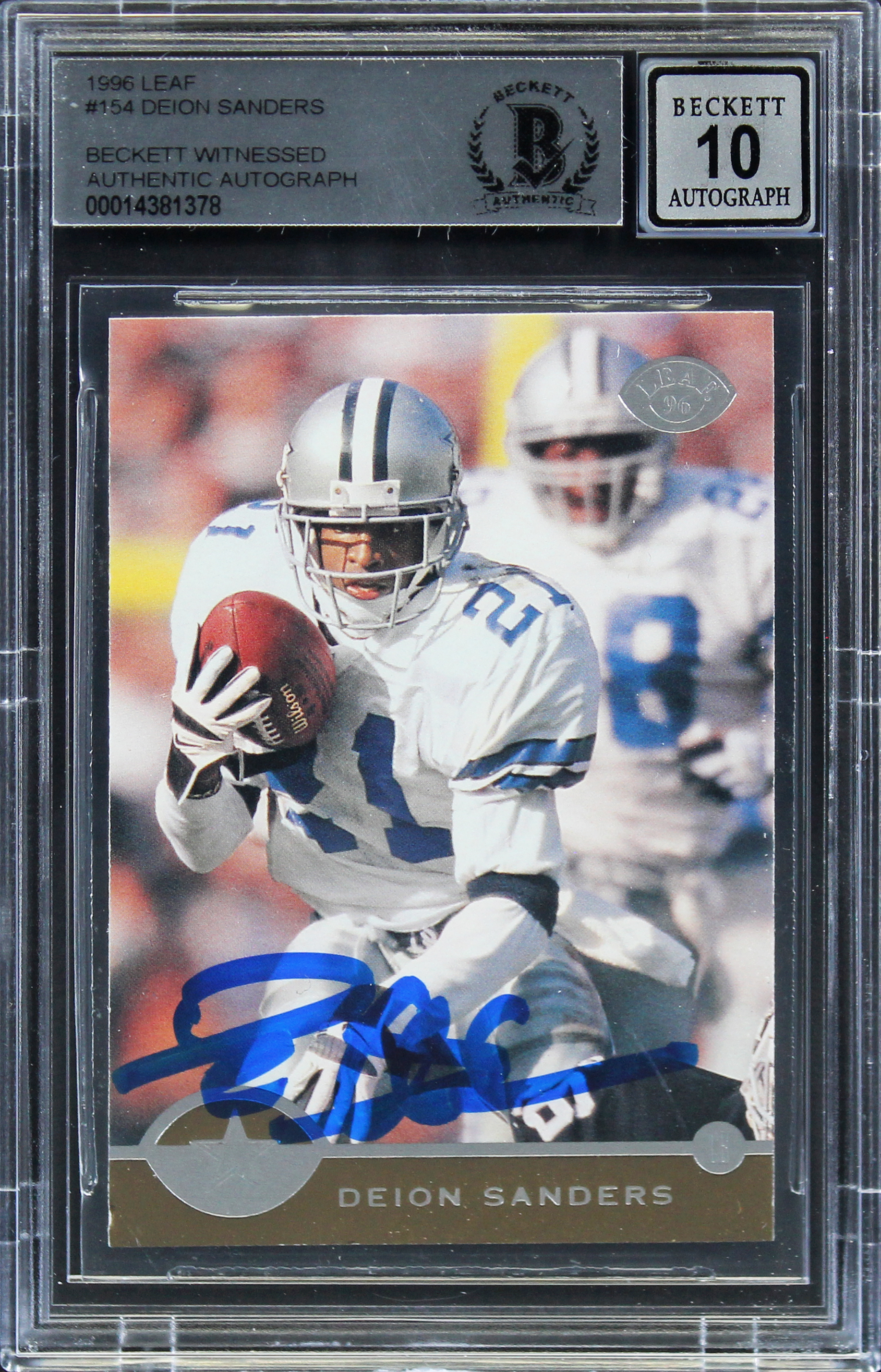 Cowboys Deion Sanders Authentic Signed 1996 Leaf #154 Card Auto 10! BAS Slabbed