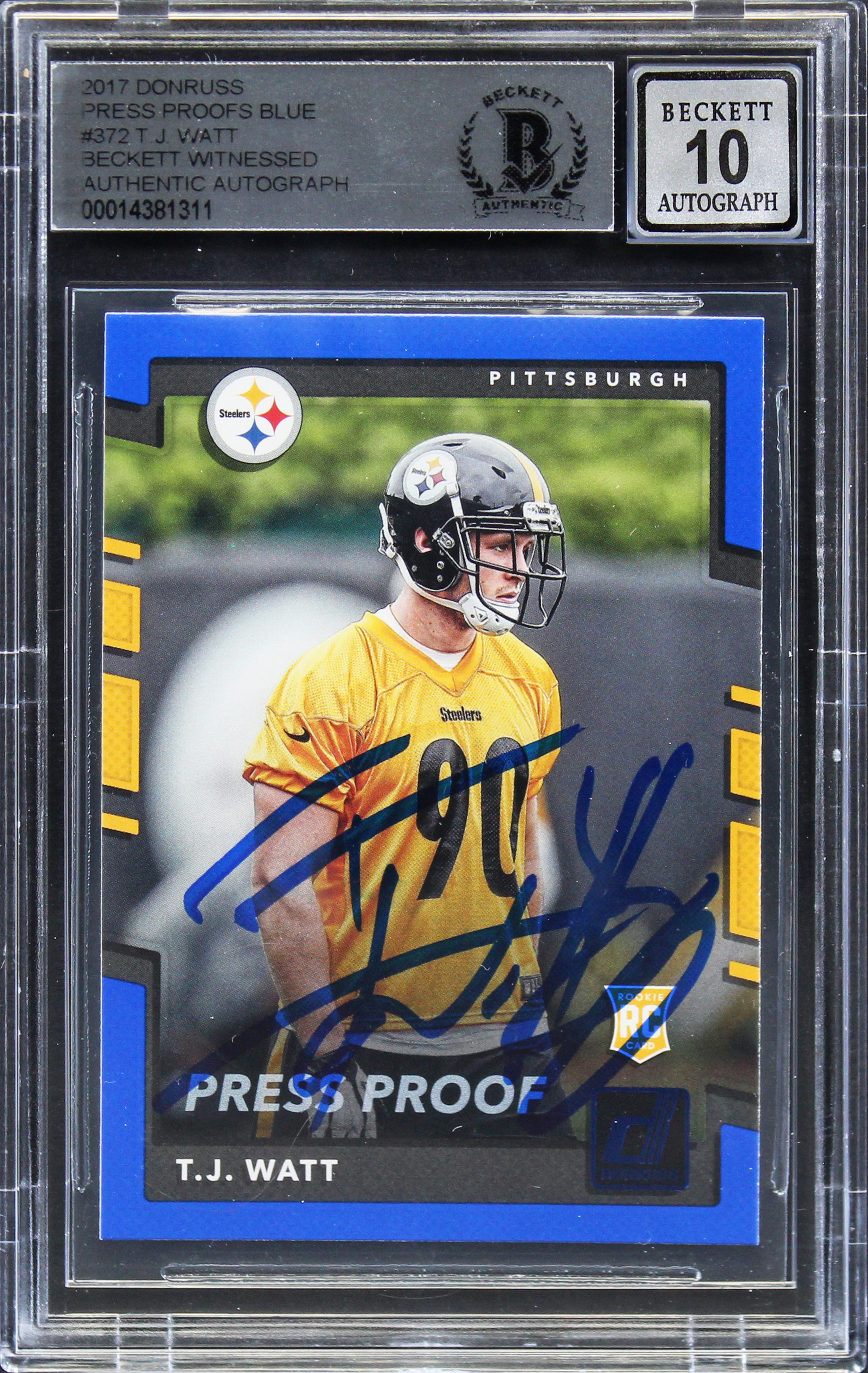T.J. Watt Signed 2017 Donruss Press Proofs Blue #372 RC Card Auto 10 BAS Slabbed