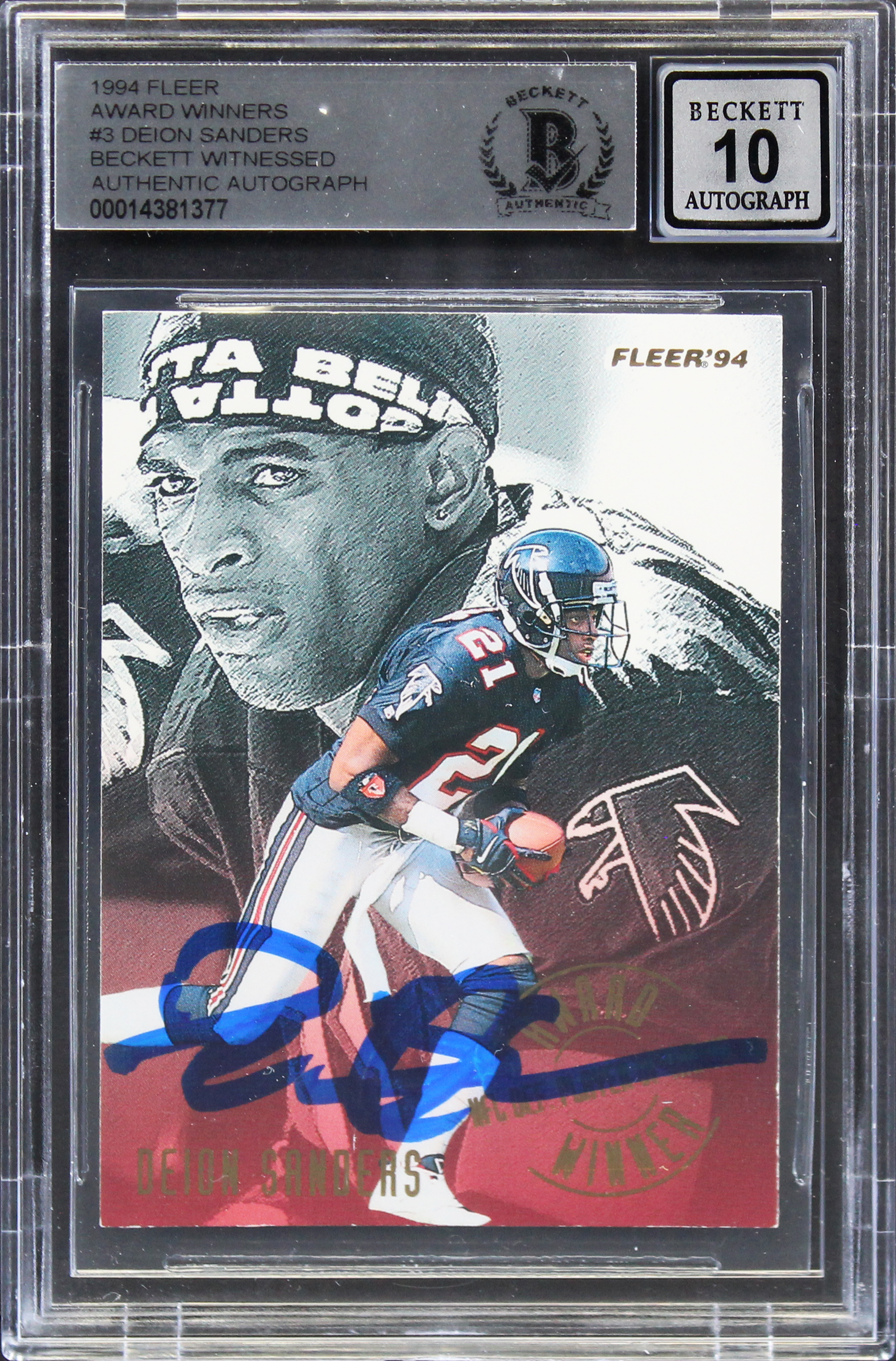 Falcons Deion Sanders Signed 1994 Fleer Award Winners #3 Card Auto 10! BAS Slab