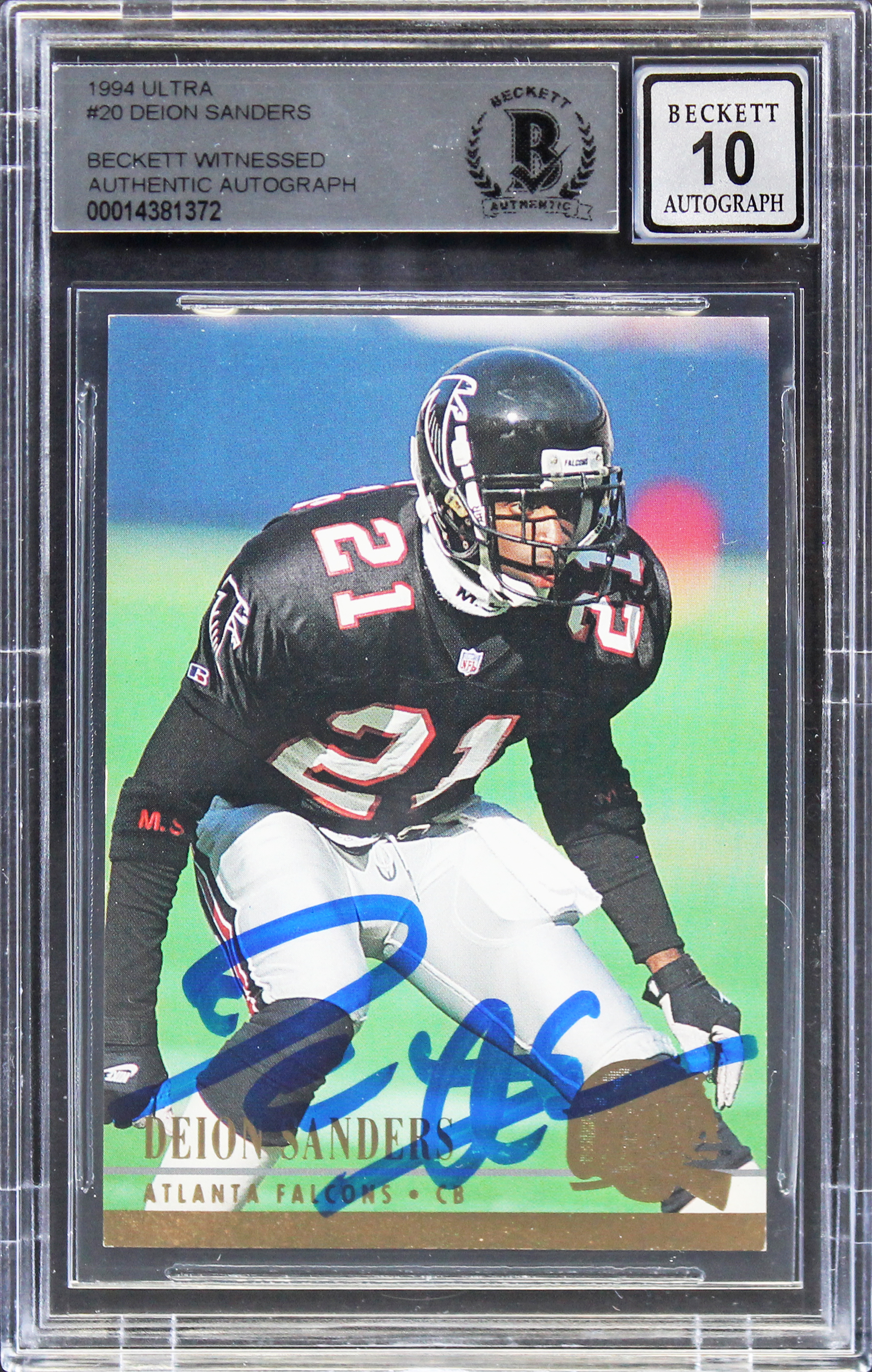 Falcons Deion Sanders Authentic Signed 1994 Ultra #20 Card Auto 10! BAS Slabbed