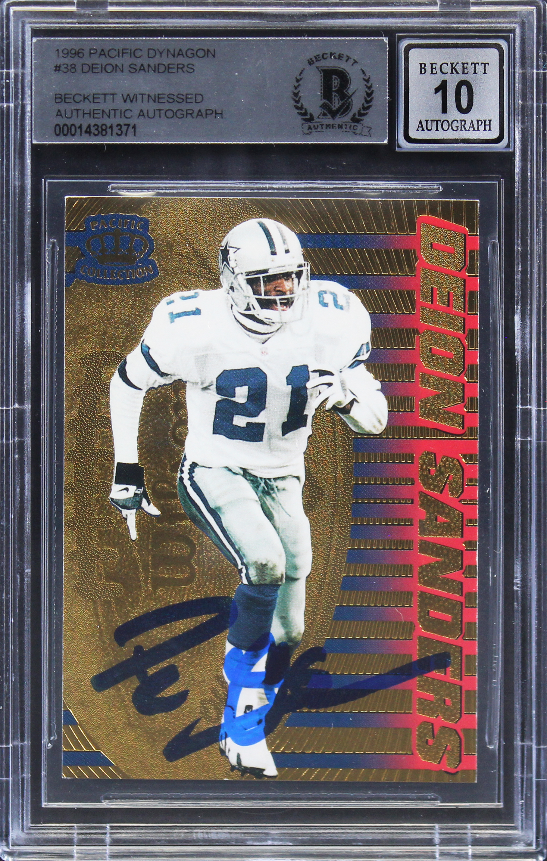 Cowboys Deion Sanders Signed 1996 Pacific Dynagon #38 Card Auto10! BAS Slabbed