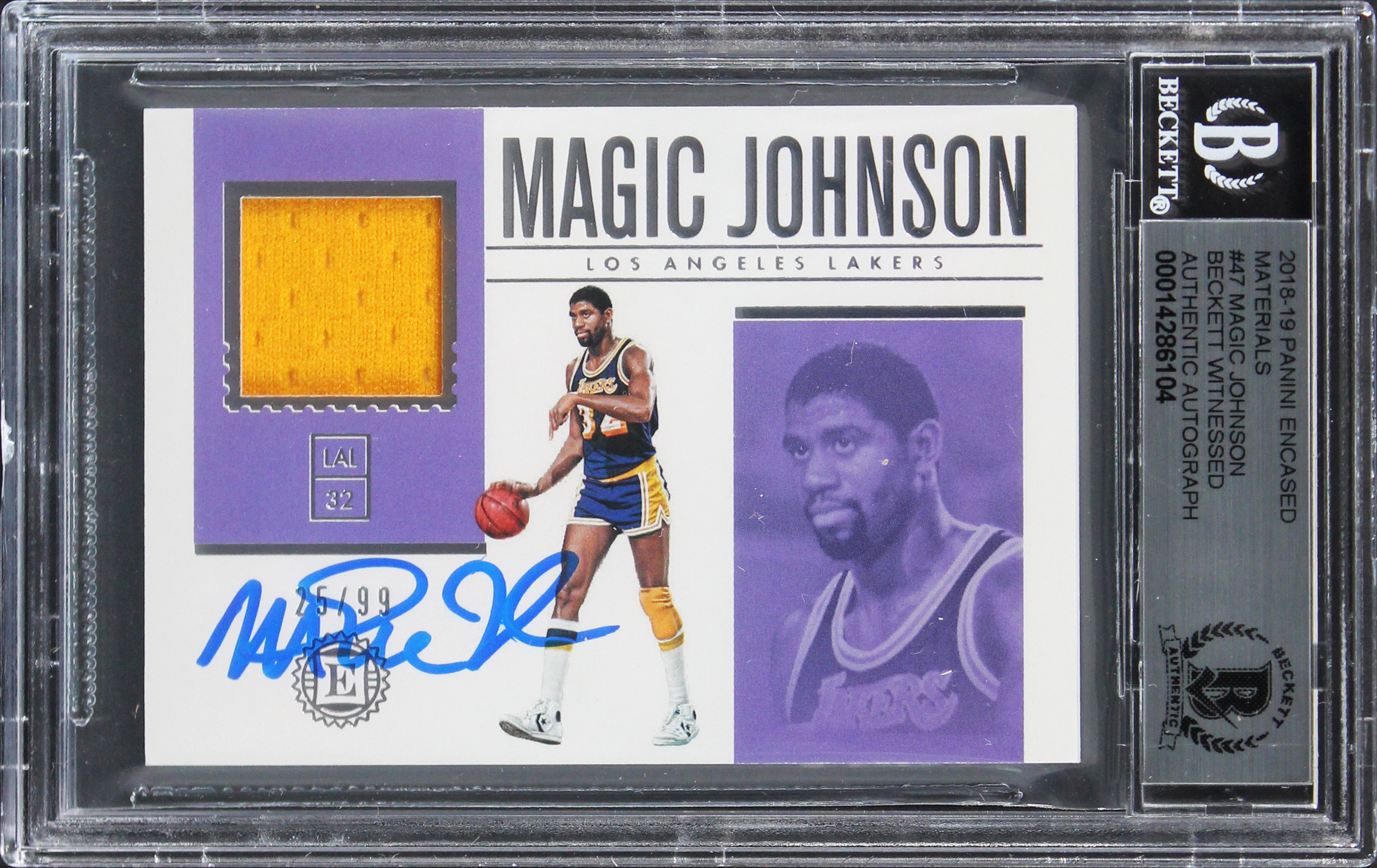 Magic Johnson Signed 2018 Panini Encased Mat #47 #25/99 Card Auto 10 BAS Slabbed