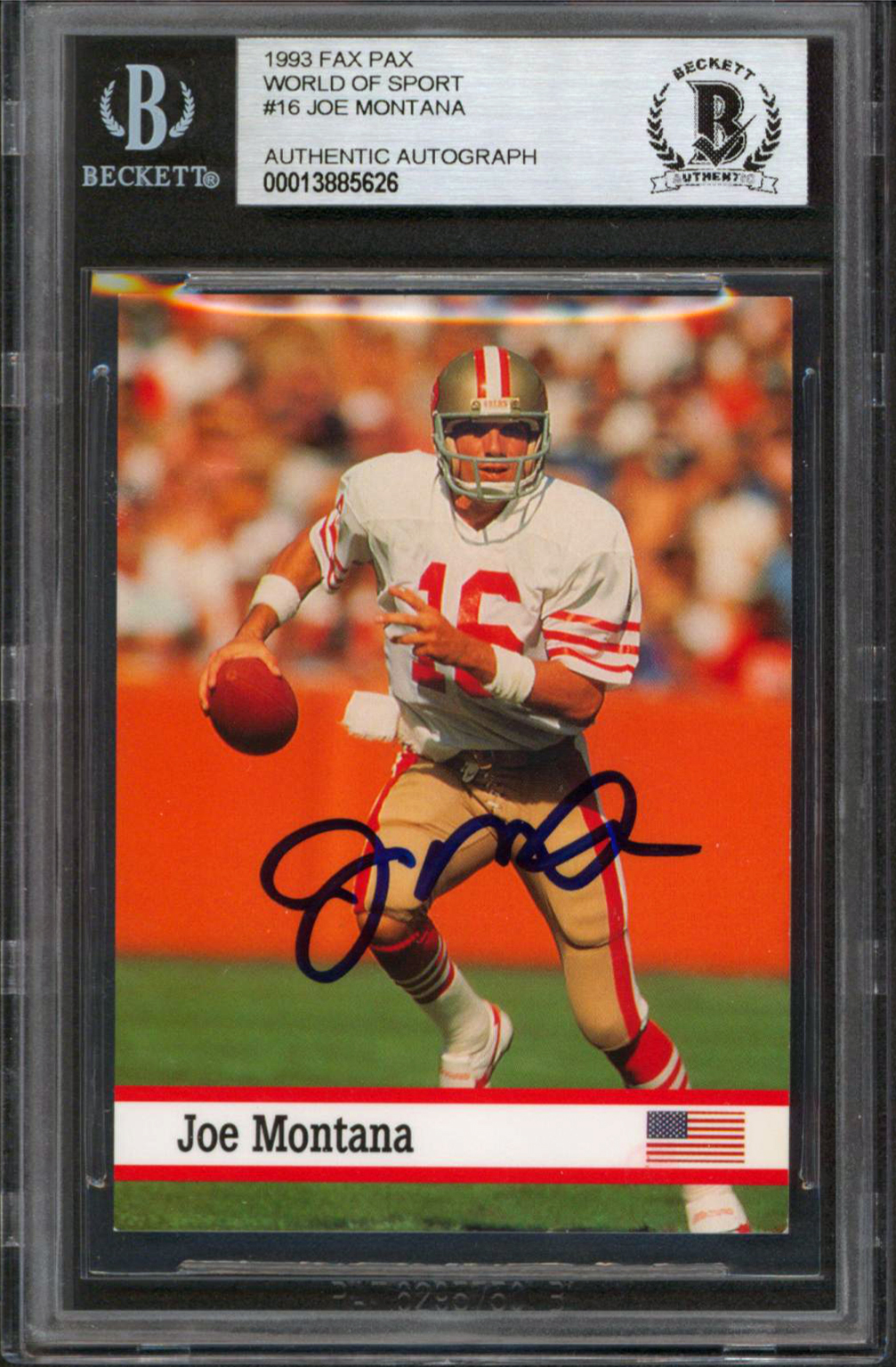 49ers Joe Montana Authentic Signed 1993 Fax Pax World Of Sport #16 Card BAS Slab