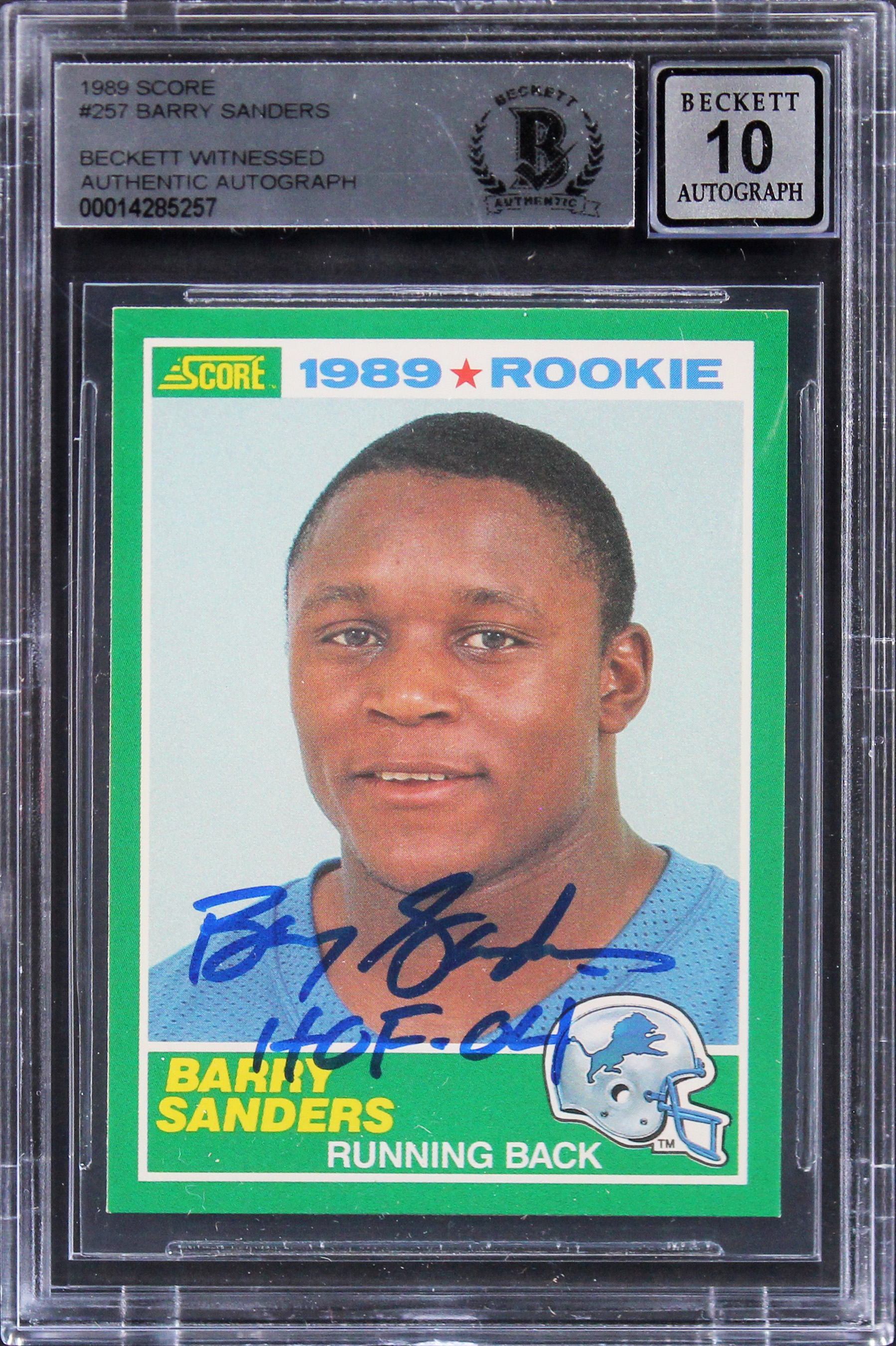 Lions Barry Sanders "HOF 04" Signed 1989 Score #257 Rookie Card Auto 10 BAS Slab