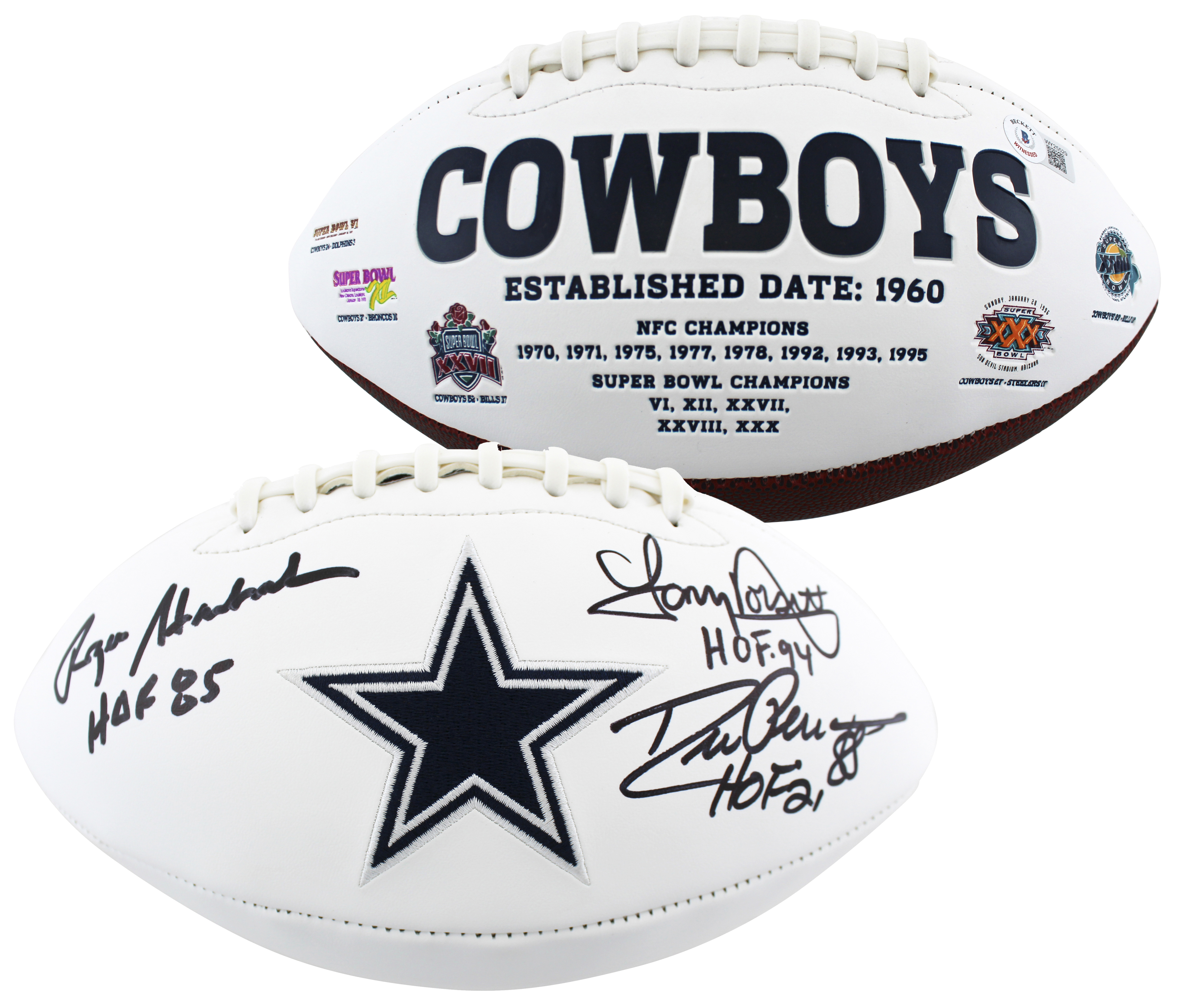Cowboys (3) Staubach, Dorsett & Pearson Signed White Panel Logo Football BAS Wit