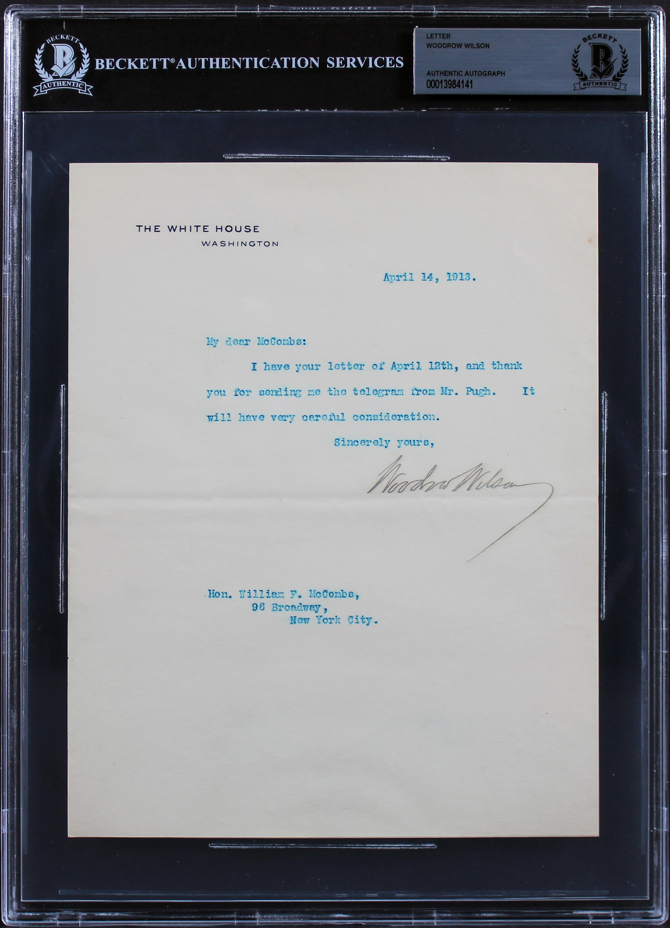Woodrow Wilson Signed 7x8.75 1913 Letter On White House Letterhead BAS Slab