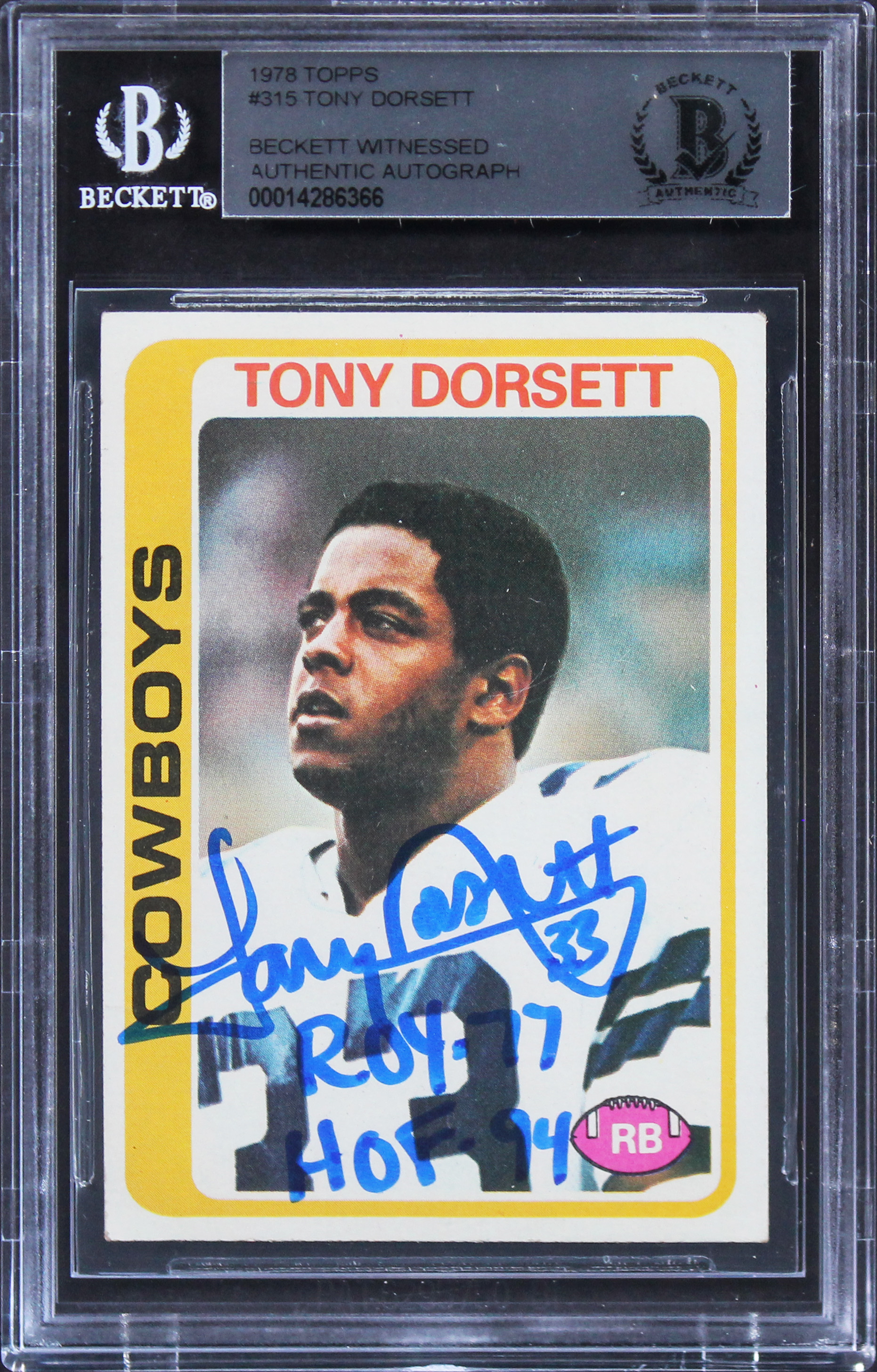 Cowboys Tony Dorsett "ROY 77, HOF 94" Signed 1978 Topps #315 RC Card BAS Slab 9