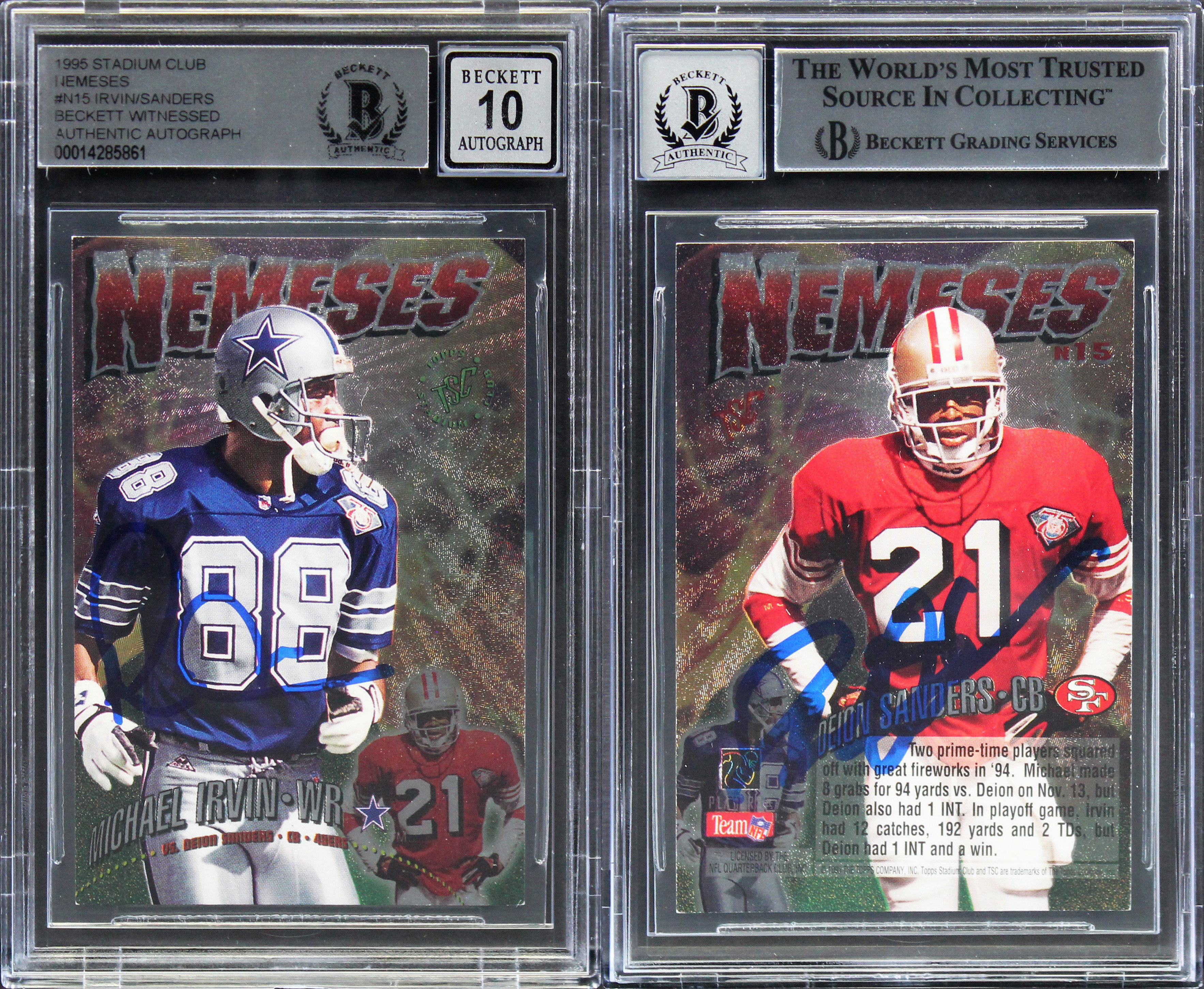 Michael Irvin Deion Sanders Signed 1995 Stadium Club #N15 Card Auto 10 BAS Slab