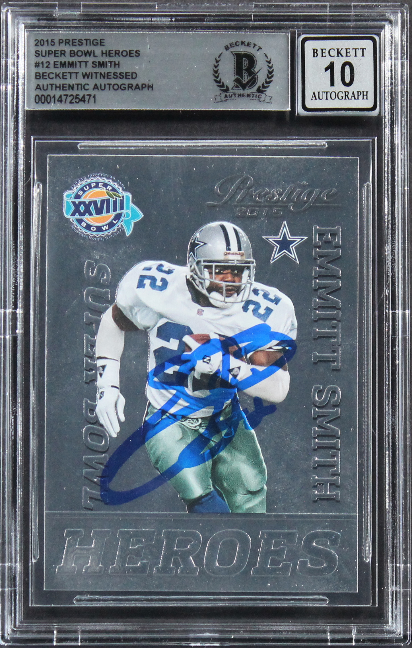 Cowboys Emmitt Smith Signed 2015 Prestige SB Heroes #12 Card Auto 10 BAS Slabbed