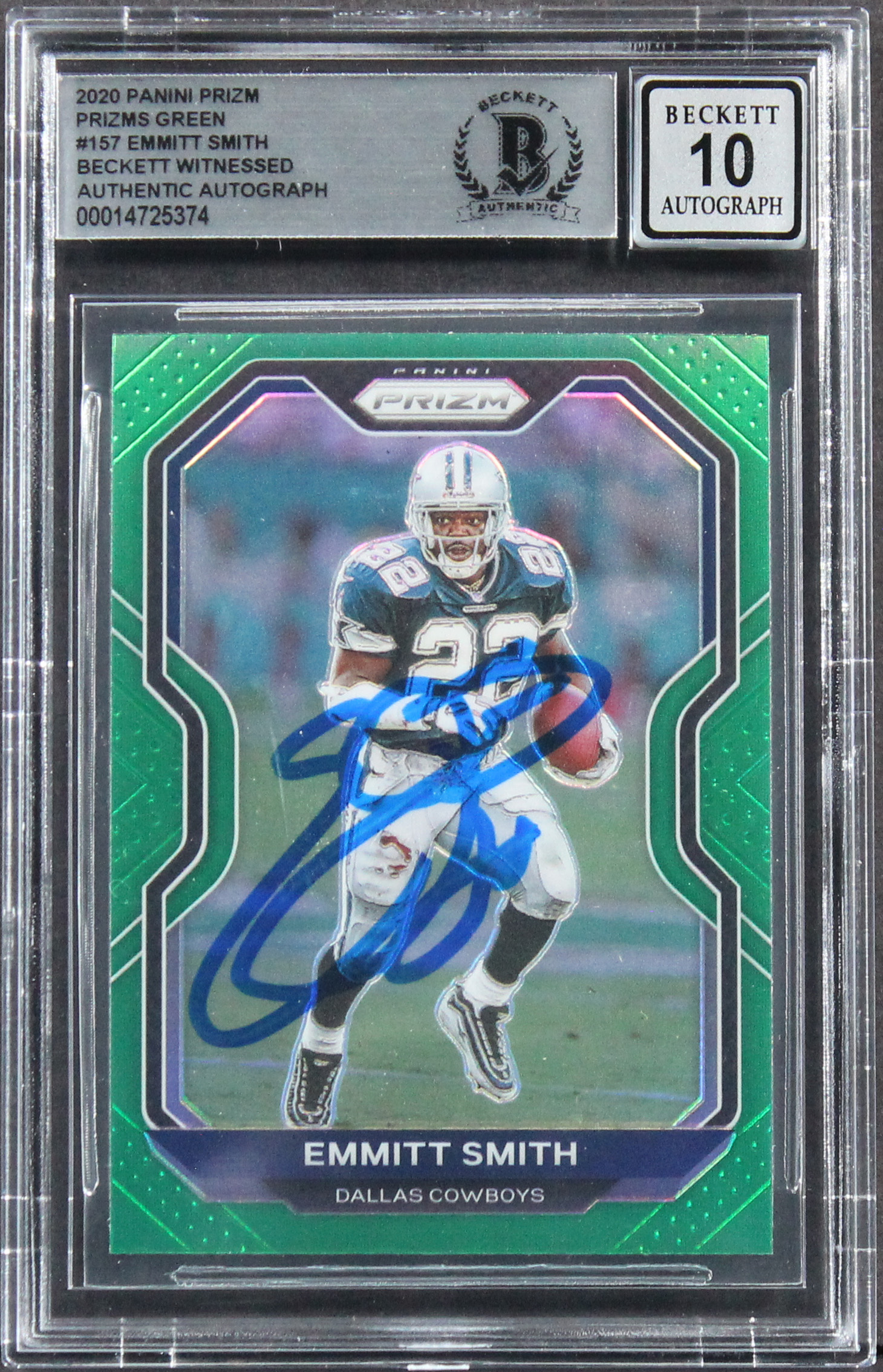 Cowboys Emmitt Smith Signed 2020 Panini Prizm Green #157 Card Auto 10! BAS Slab