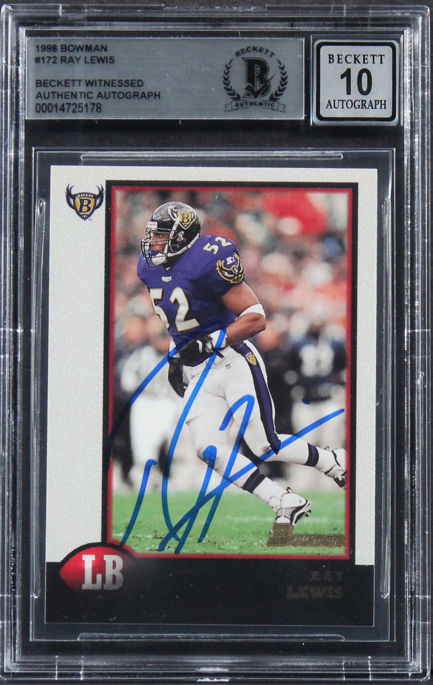 Ravens Ray Lewis Authentic Signed 1998 Bowman #172 Card Auto 10! BAS Slabbed