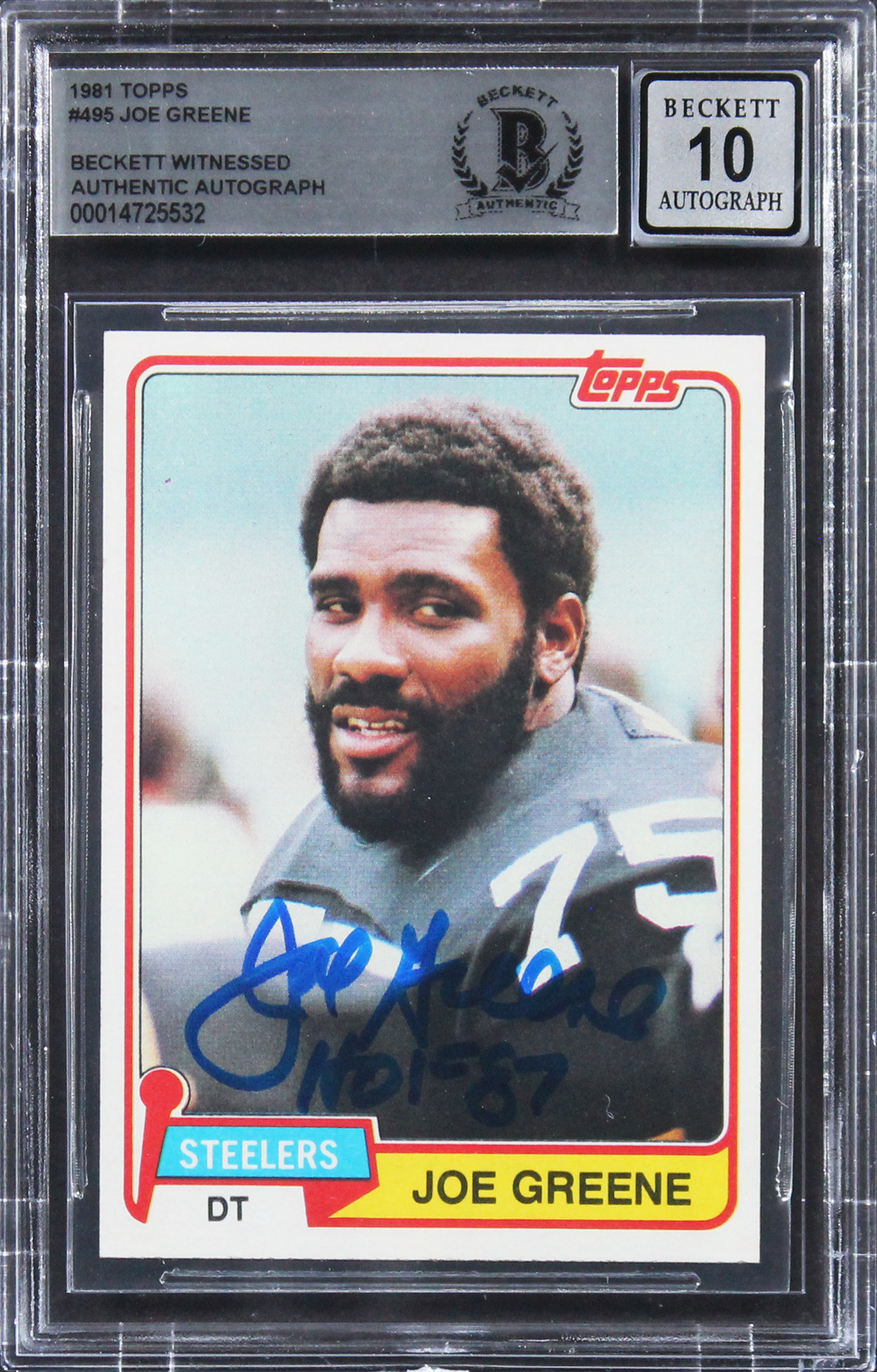 Steelers Joe Greene Signed 1981 Topps #495 Card Auto Graded Gem Mint 10 BAS Slab