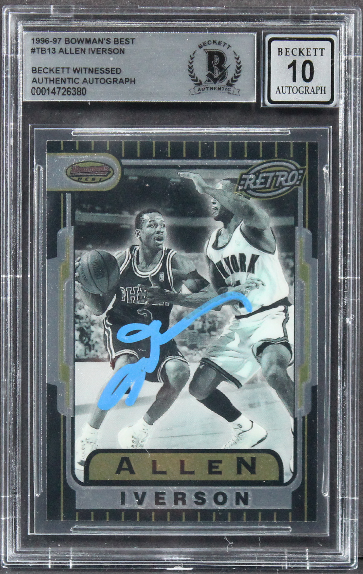 76ers Allen Iverson Signed 1996 Bowman's Best #TB13 Rookie Card Auto 10 BAS Slab