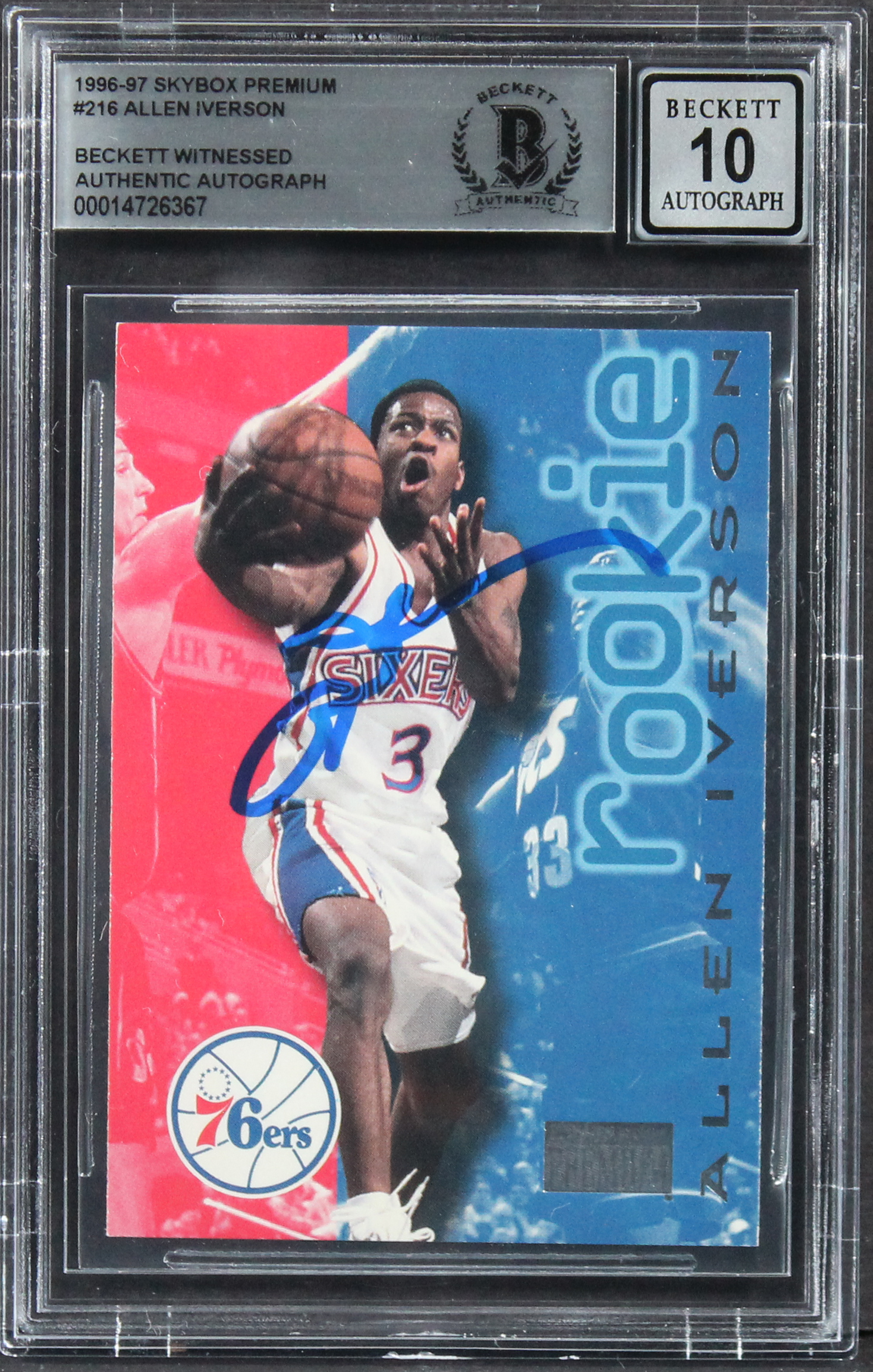 Allen Iverson Signed 1996 Skybox Premium #216 Rookie Card Auto 10! BAS Slabbed