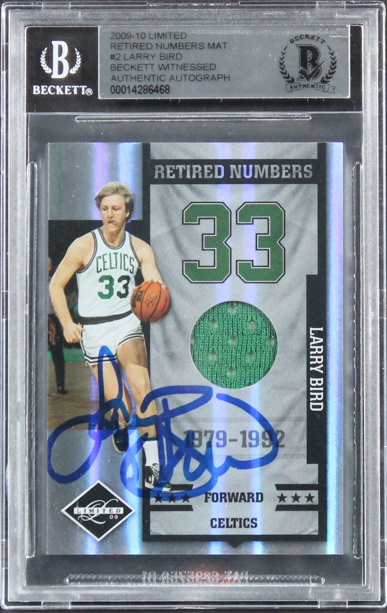 Larry Bird Signed 2009 Limited Retired Numbers Mat #2 #38/99 Card BAS Slabbed