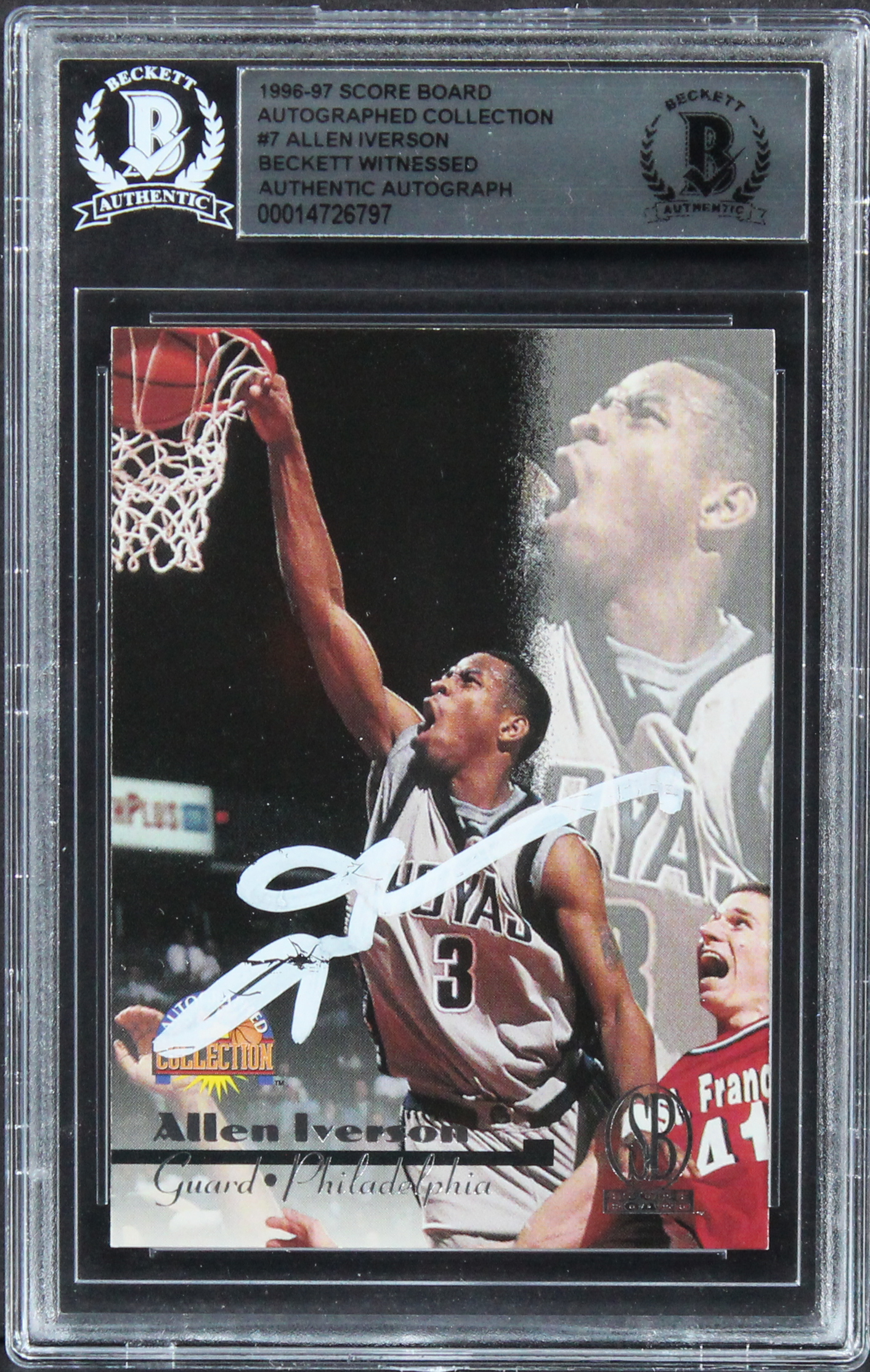 76ers Allen Iverson Signed 1996 Score Board Collection #7 Rookie Card BAS Slab