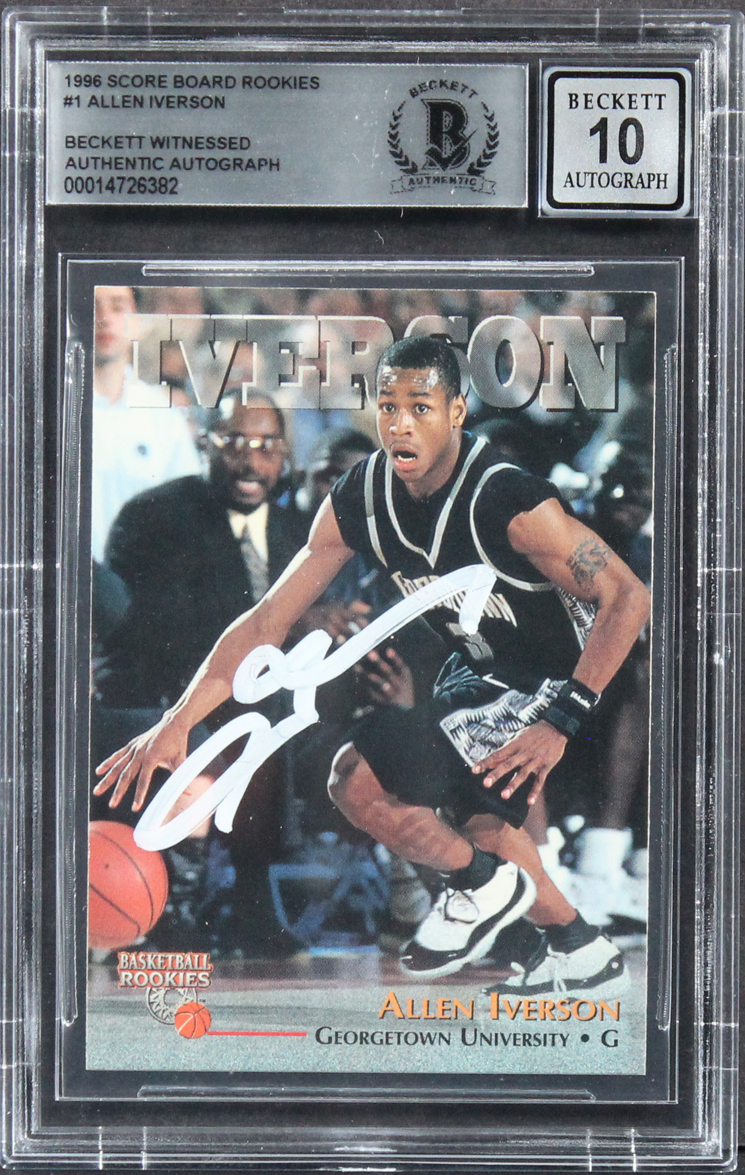 76ers Allen Iverson Signed 1996 Score Boards #1 Rookie Card Auto 10! BAS Slabbed