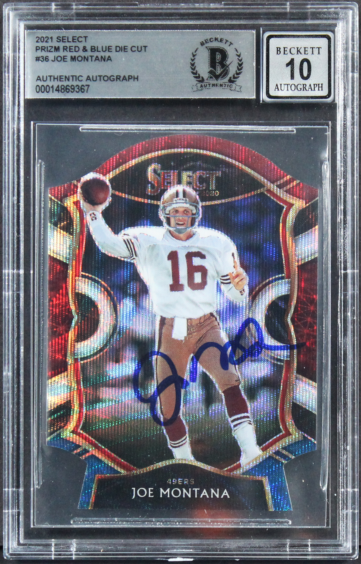 49ers Joe Montana Signed 2021 Select Prizm R&B Die Cut #36 Card Auto 10 BAS Slab