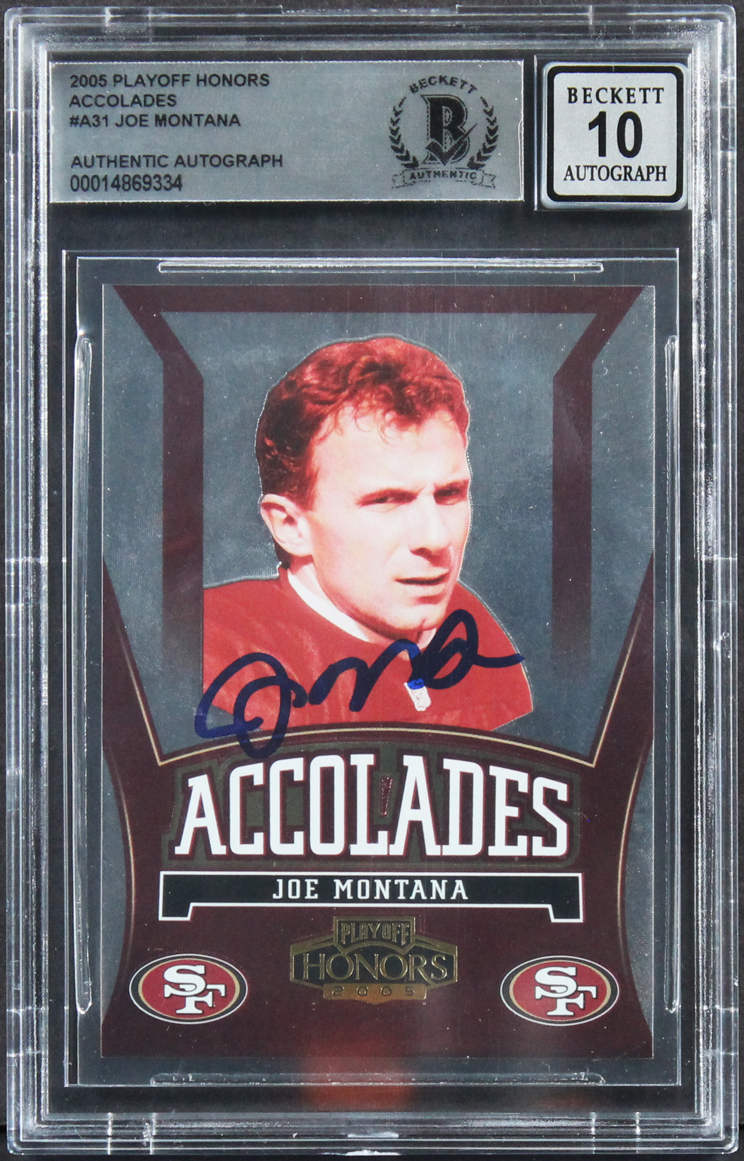 Joe Montana Signed 2005 Playoff Honors Accolades #A31 Card Auto 10! BAS Slabbed