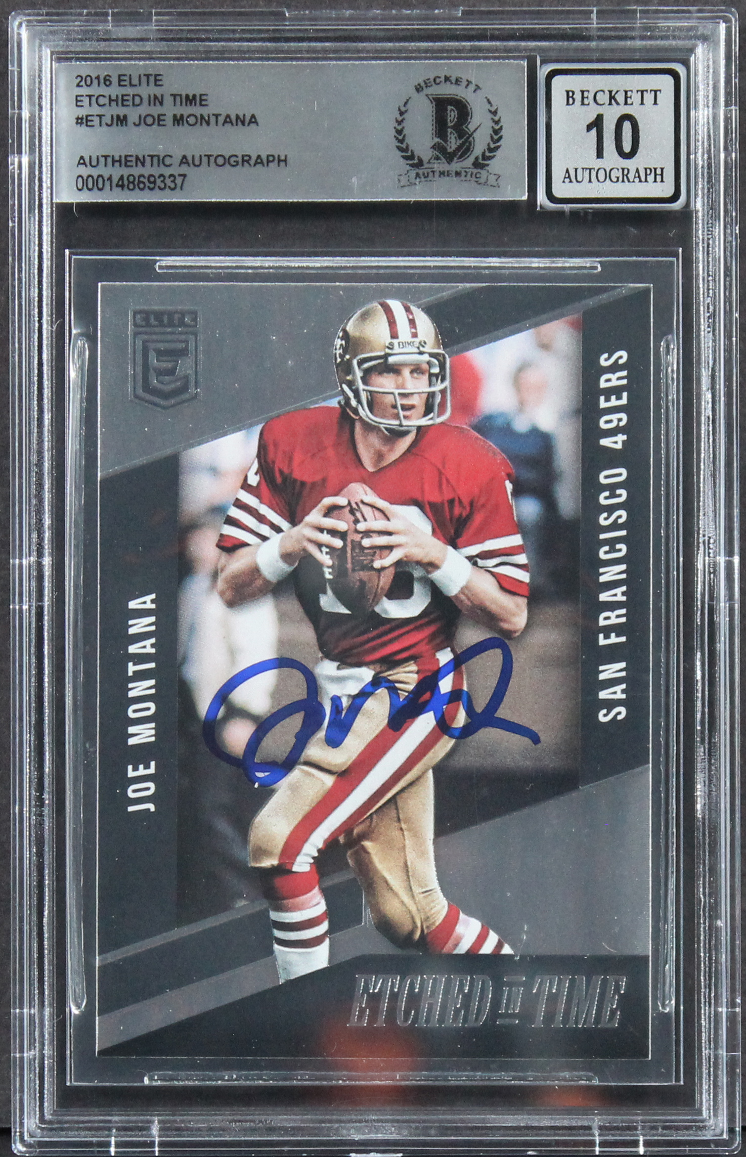 49ers Joe Montana Signed 2016 Elite Etched In Time #ETJM Card Auto 10! BAS Slab
