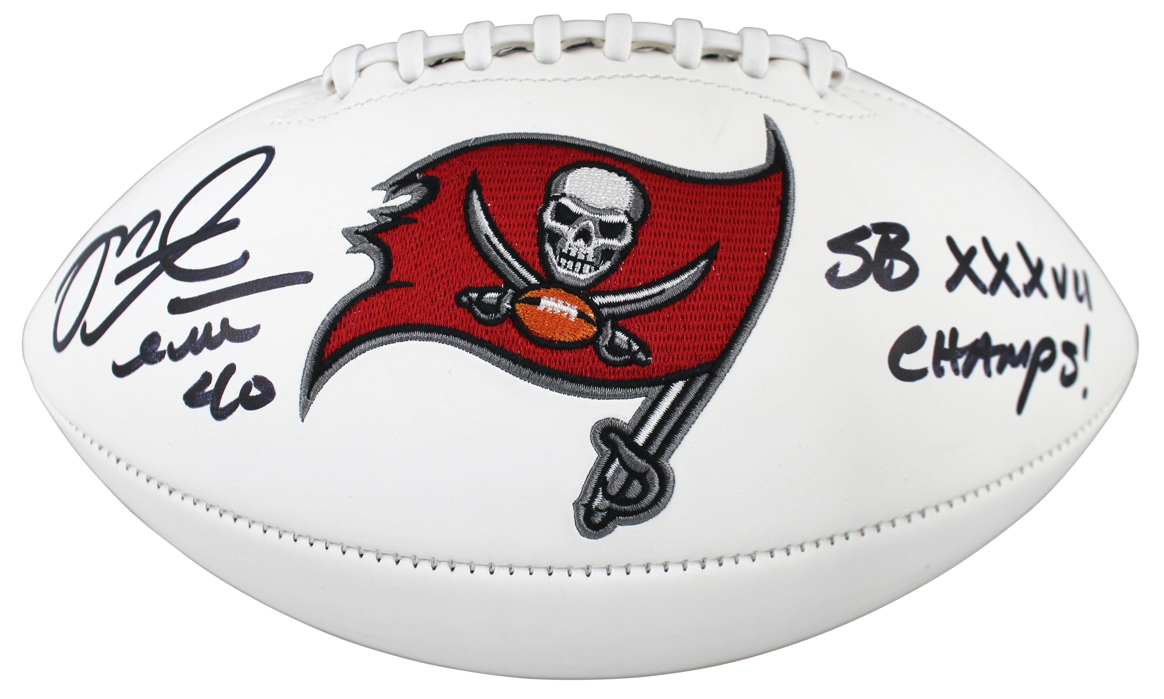 Buccaneers Mike Alstott "SB XXXVII Champs" Signed White Panel Logo Football BAS