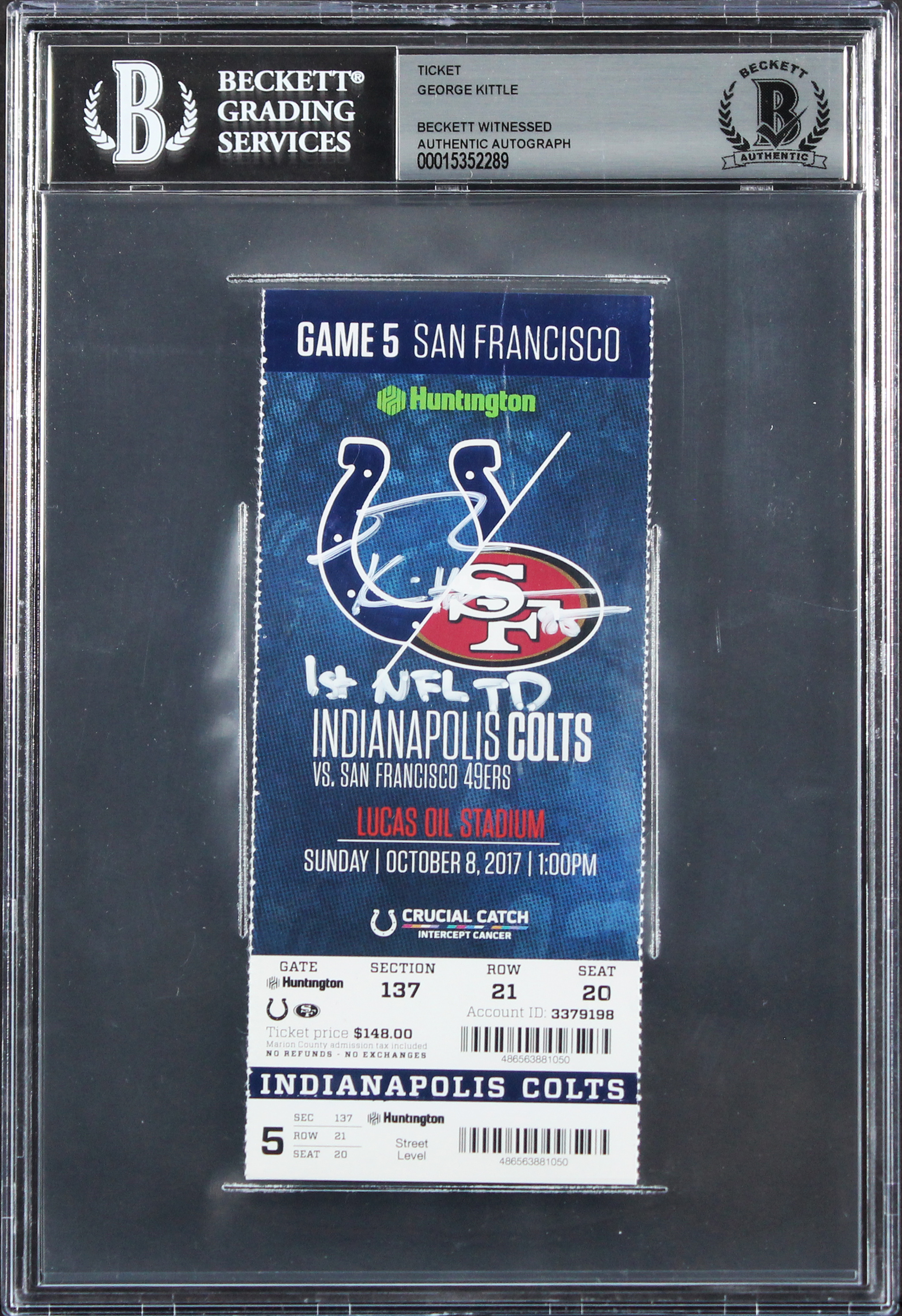 George Kittle "1st NFL TD" Signed 10/8/17 Colts Vs. 49ers Ticket Stub BAS Slab