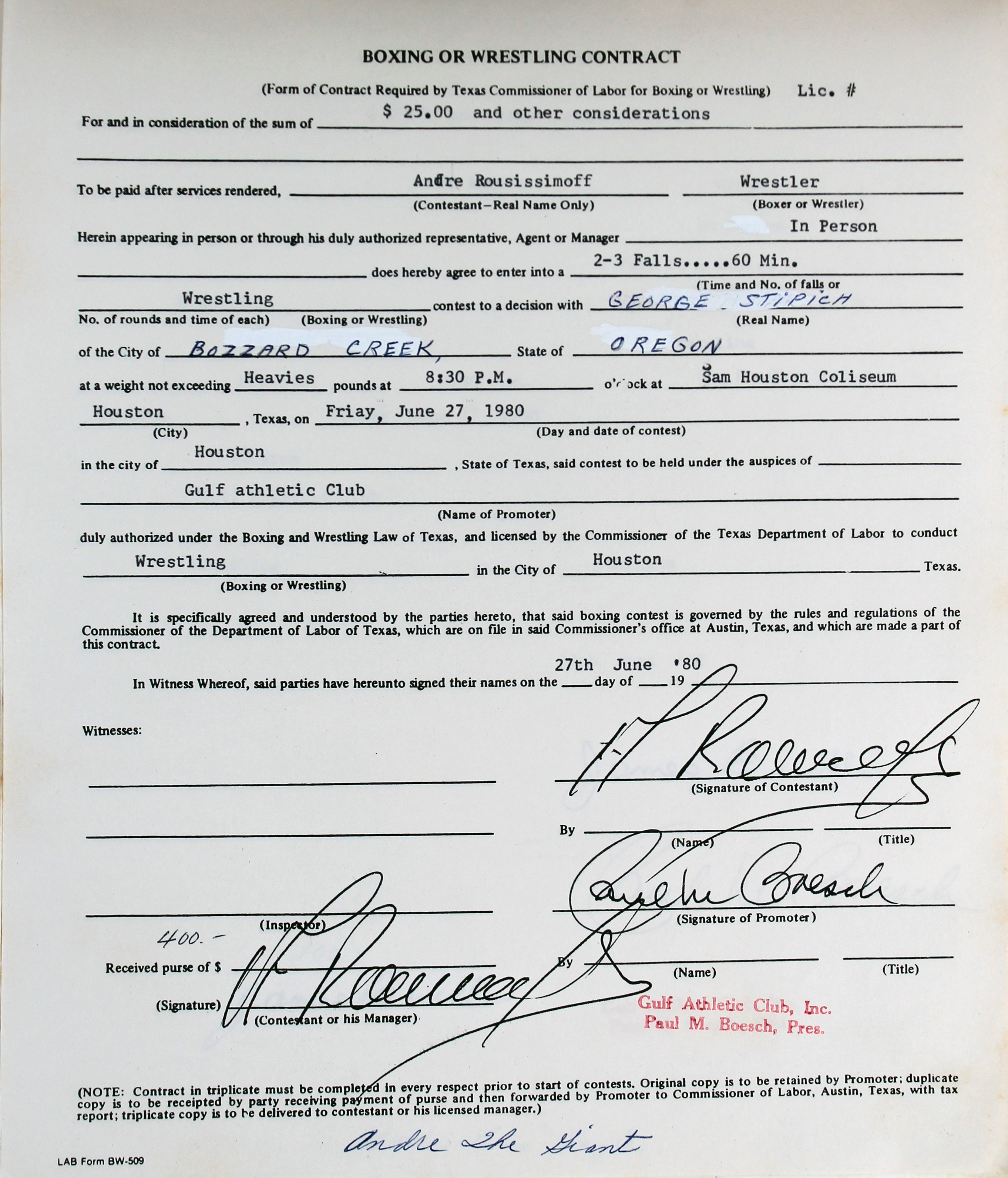 (14) Andre The Giant Pak Song Nam Signed Houston Program & Contract BAS #AA03407