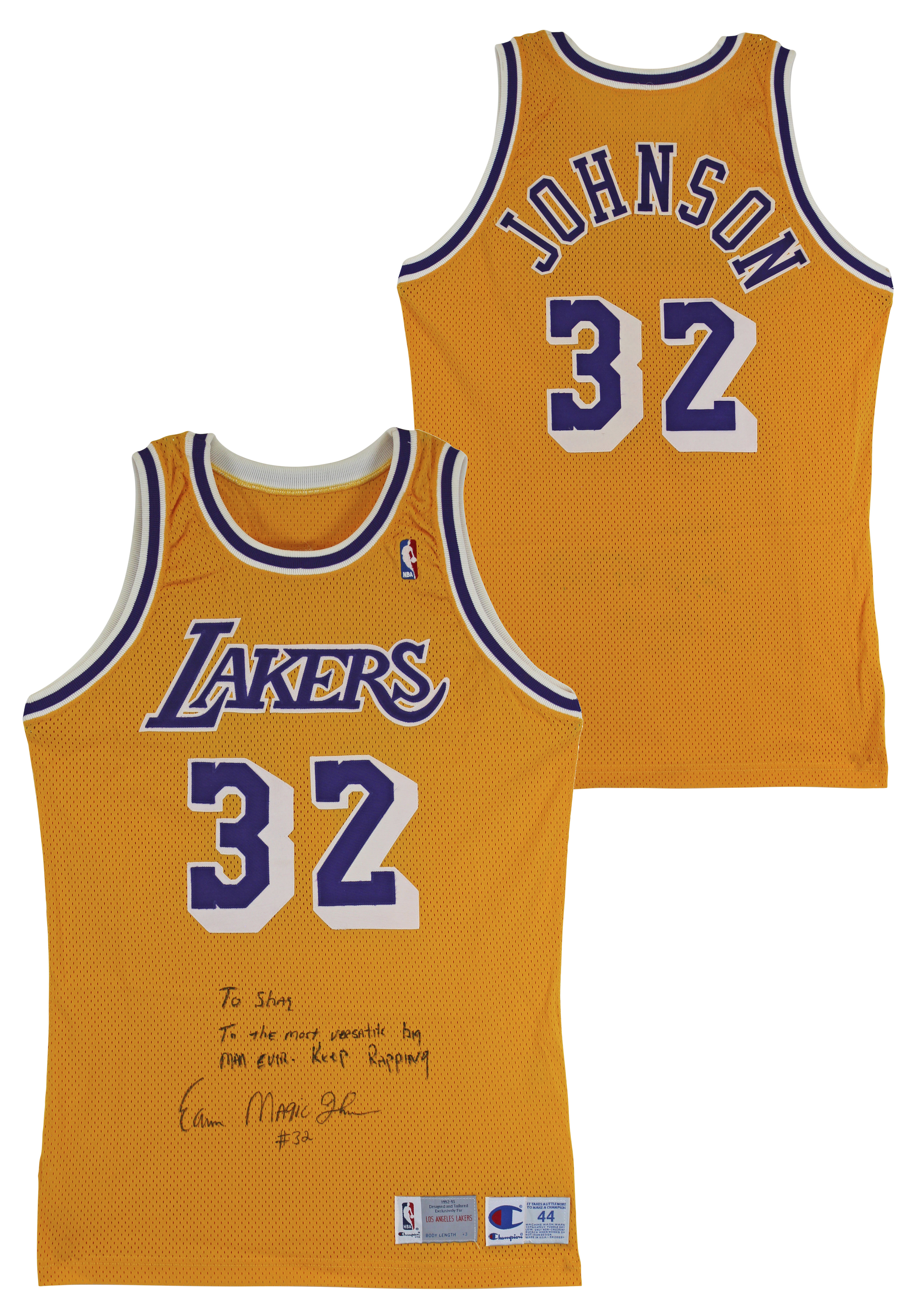 Lakers Magic Johnson "To Shaq" Signed 1992-93 Champion Size 44 Gold Jersey BAS