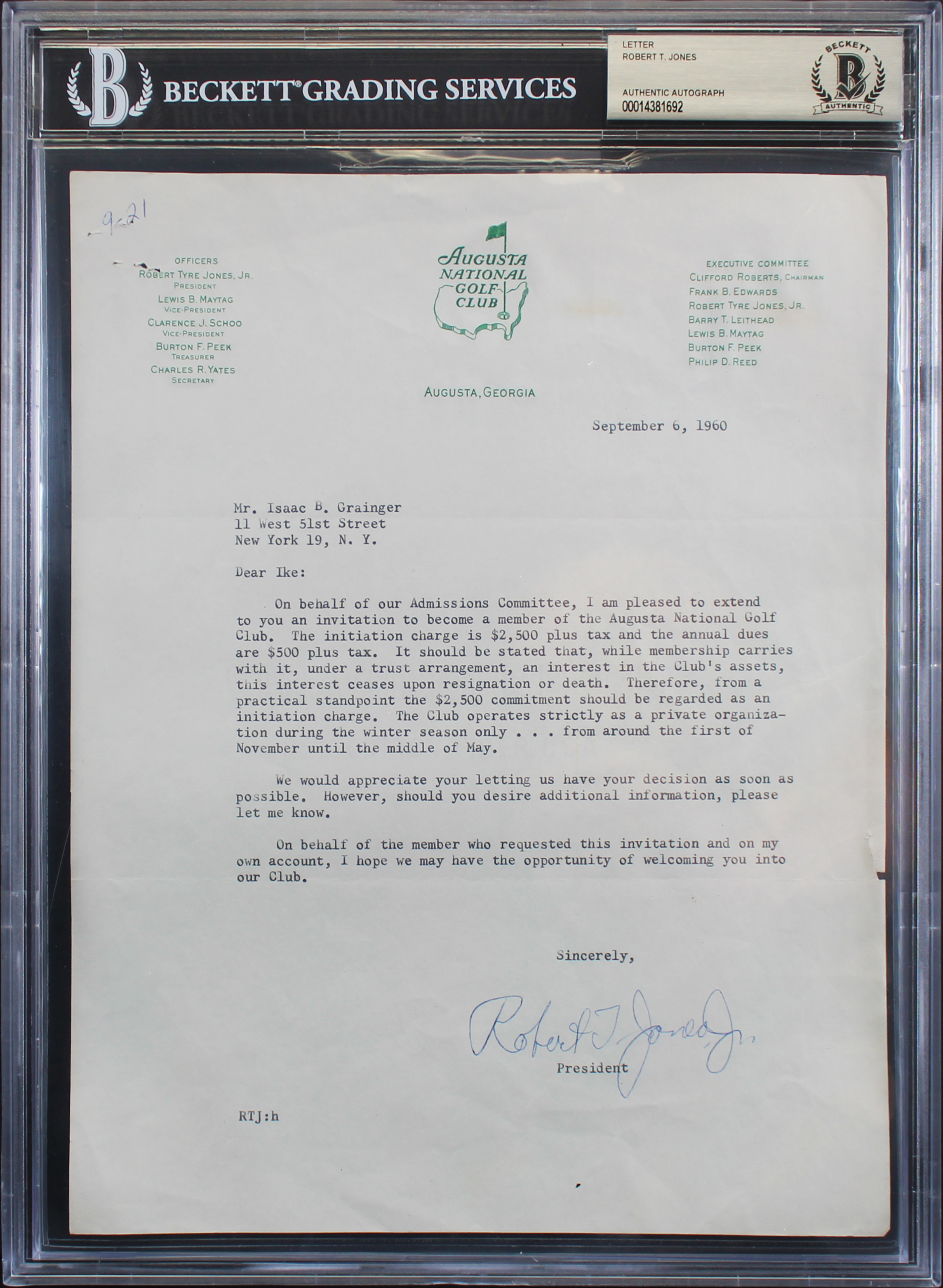 Robert T Jones Signed 8.5x11 1960 Letter on Augusta National Letterhead BAS Slab