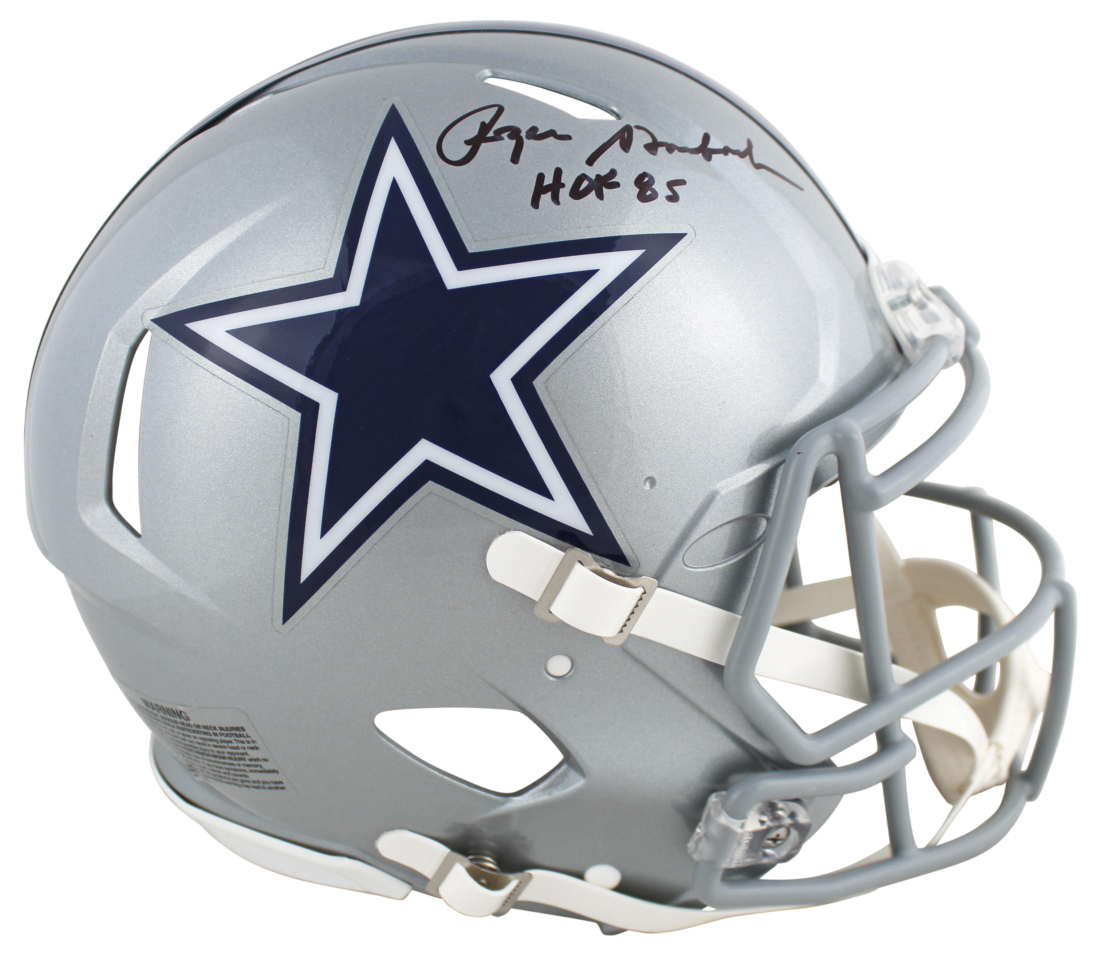 Cowboys Roger Staubach "HOF 85" Signed SIlver Full Size Speed Proline Helmet BAS