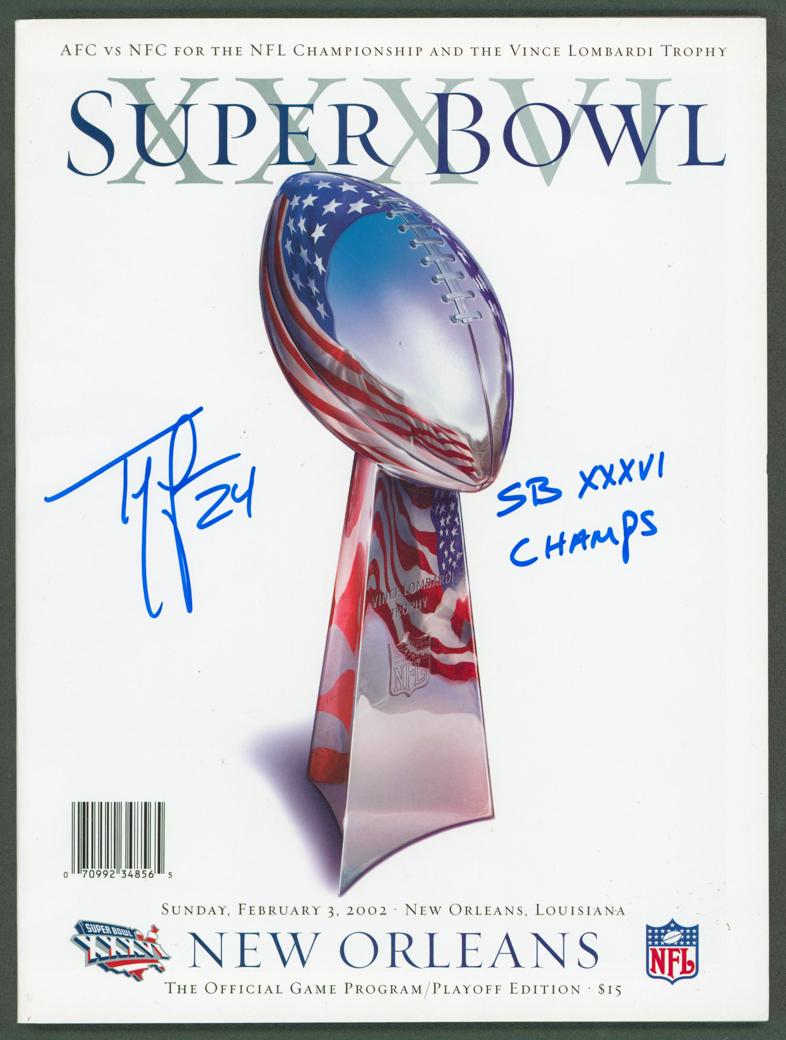 Patriots Ty Law "SB XXXVI Champs" Signed SB XXXVI Program BAS Witnessed #WK36958