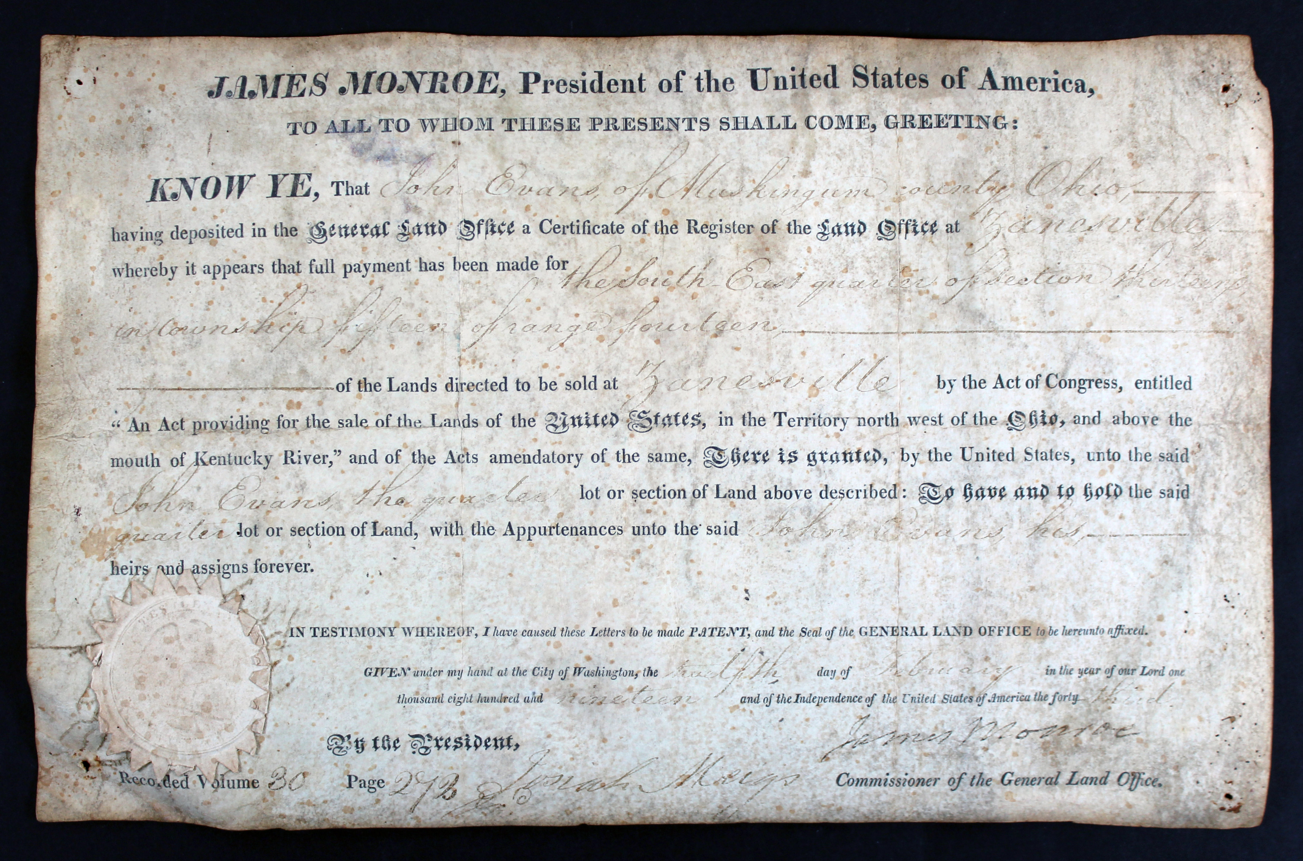 James Monroe Authentic Signed 8.25x13.25 1819 Land Grant Document JSA #BB88828