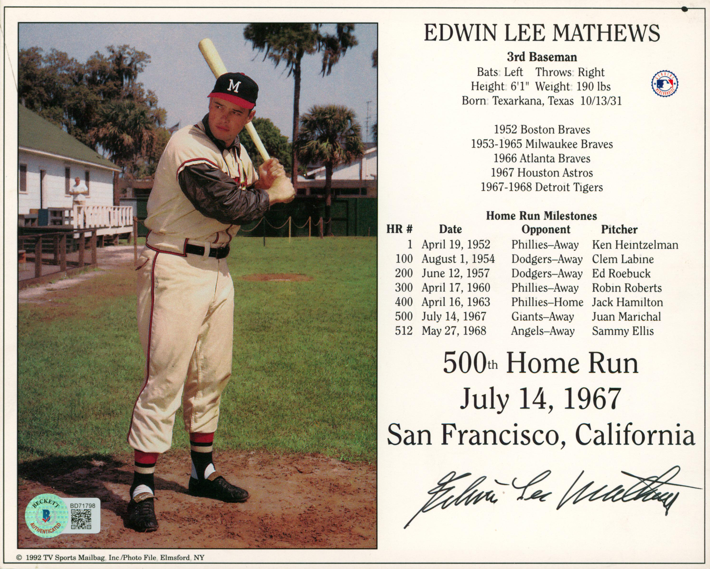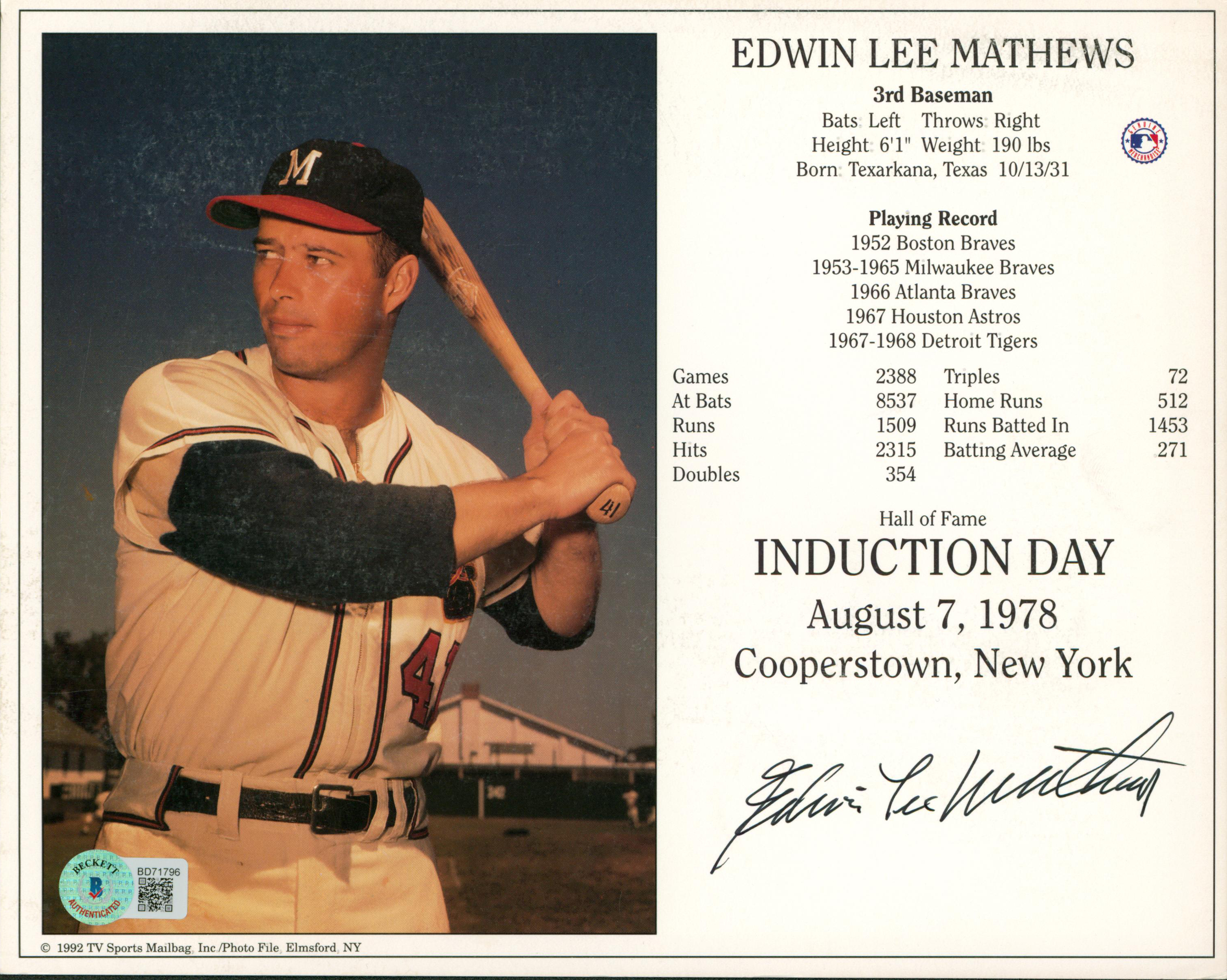 Braves Edwin Lee Mathews Authentic Signed 8x10 Photo Autographed BAS #BD71798
