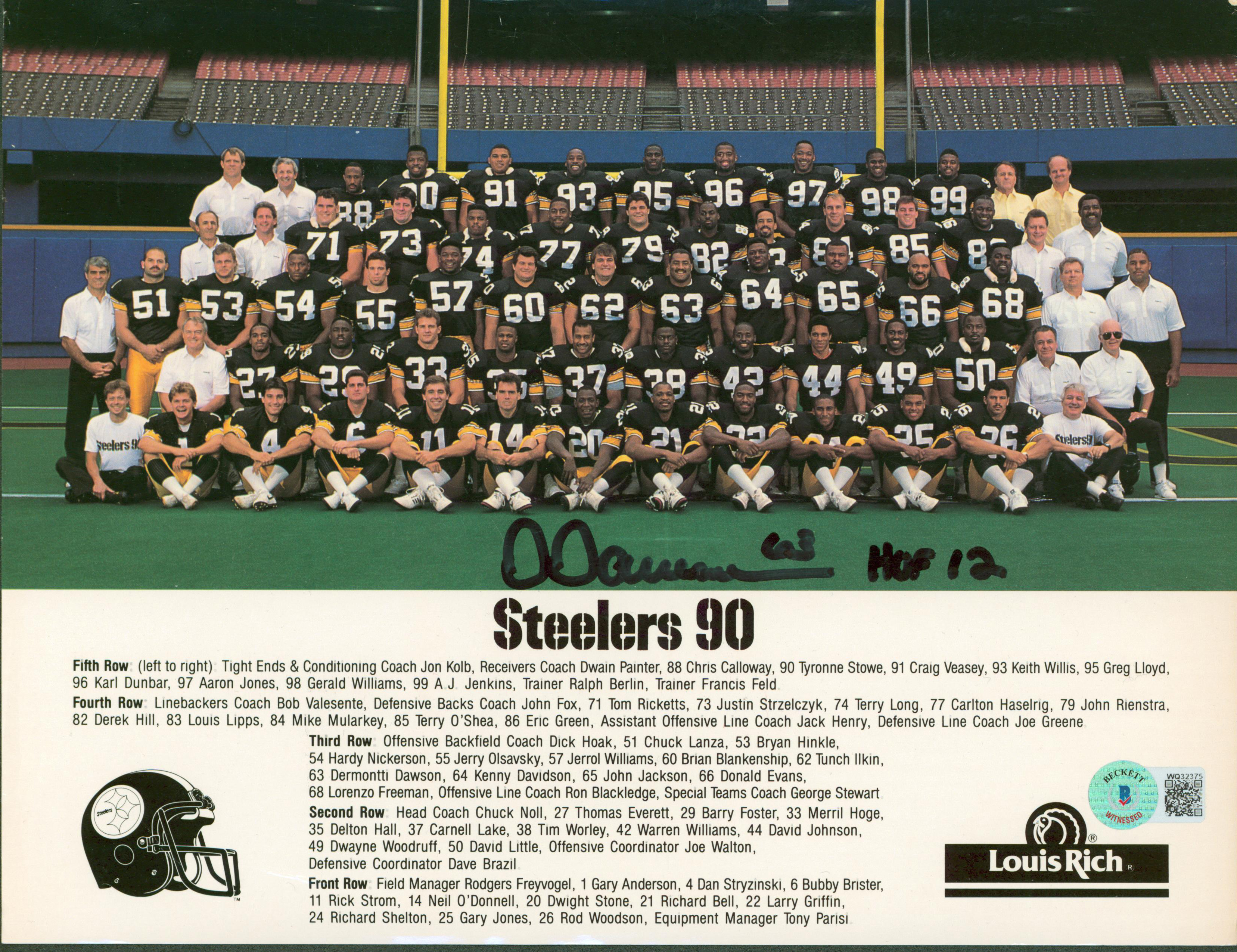 Steelers Dermontti Dawson HOF 12 Signed 8.5x11 1990 Team Photo BAS Wit #WQ32375
