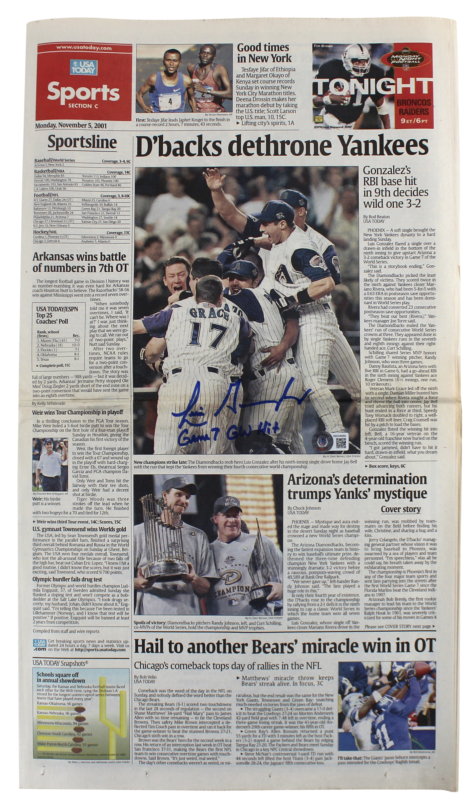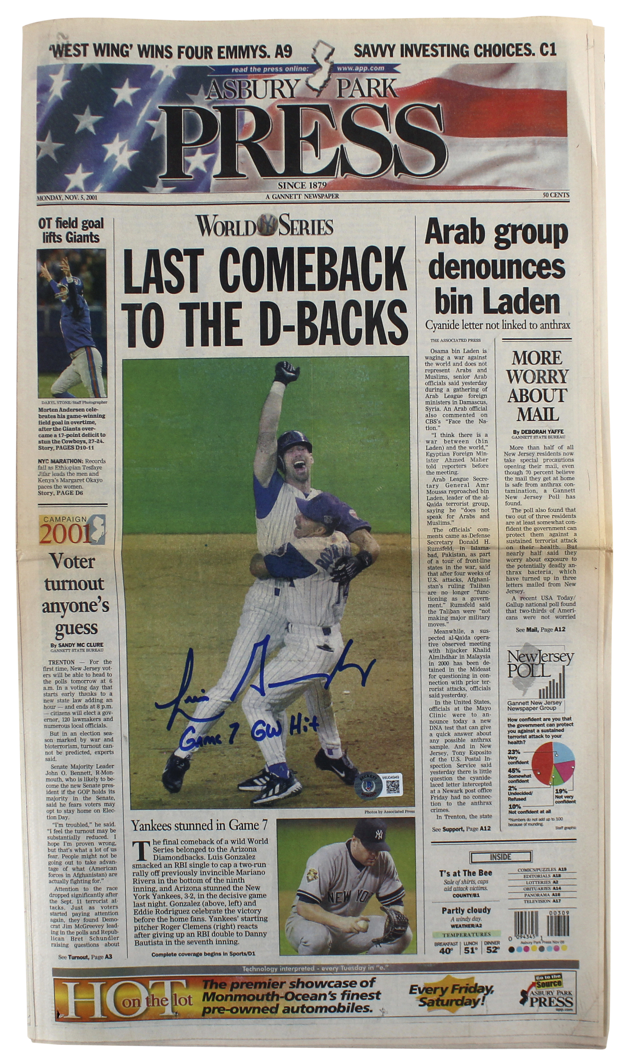 D-Backs Luis Gonzalez "Game 7 GW Hit" Signed Asbury Park Press Newspaper BAS Wit