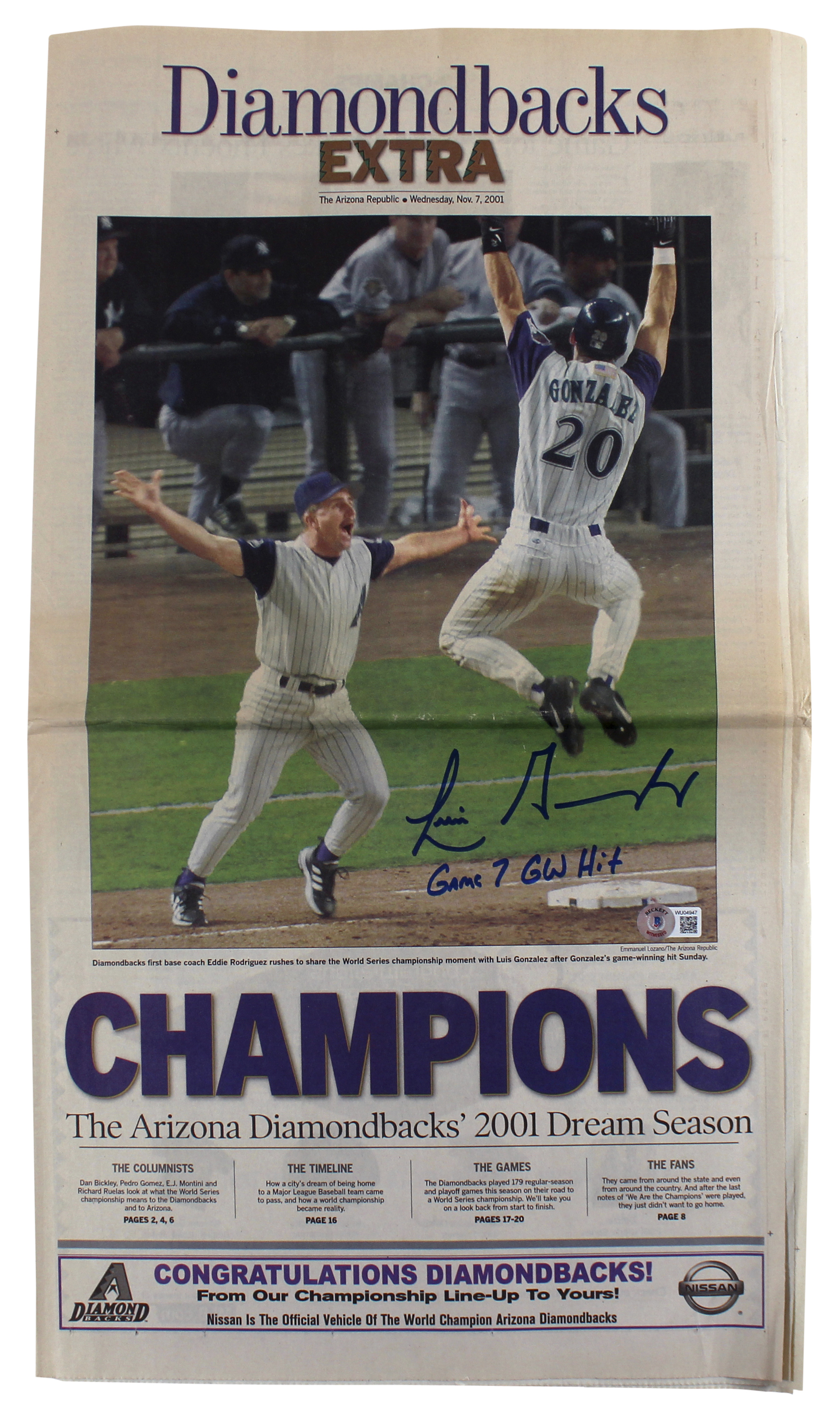 D-Backs Luis Gonzalez "Game 7 GW Hit" Signed AZ Republic Newspaper BAS #WU04947