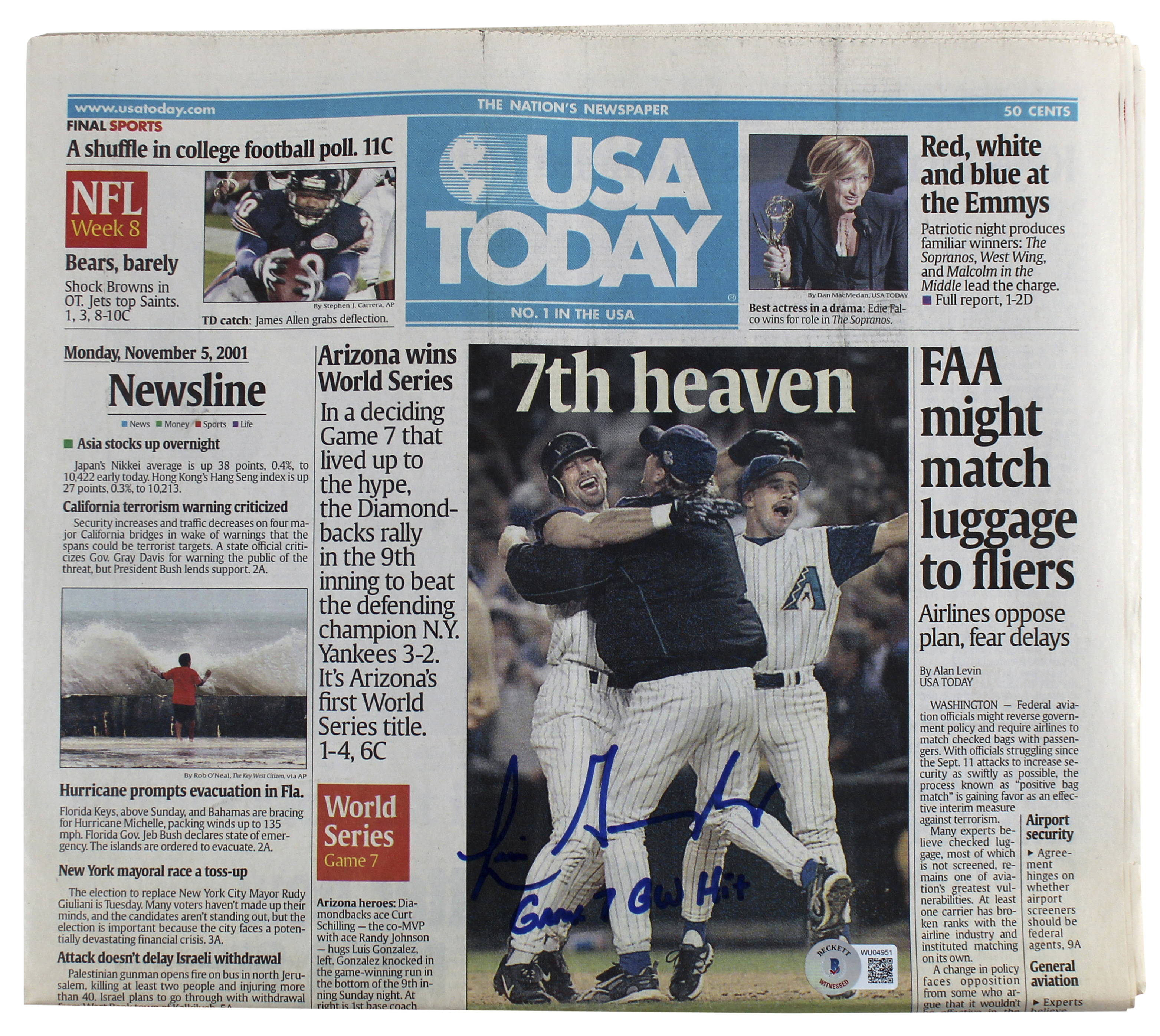 D-Backs Luis Gonzalez "Game 7 GW Hit" Signed USA Today Newspaper BAS #WU04950