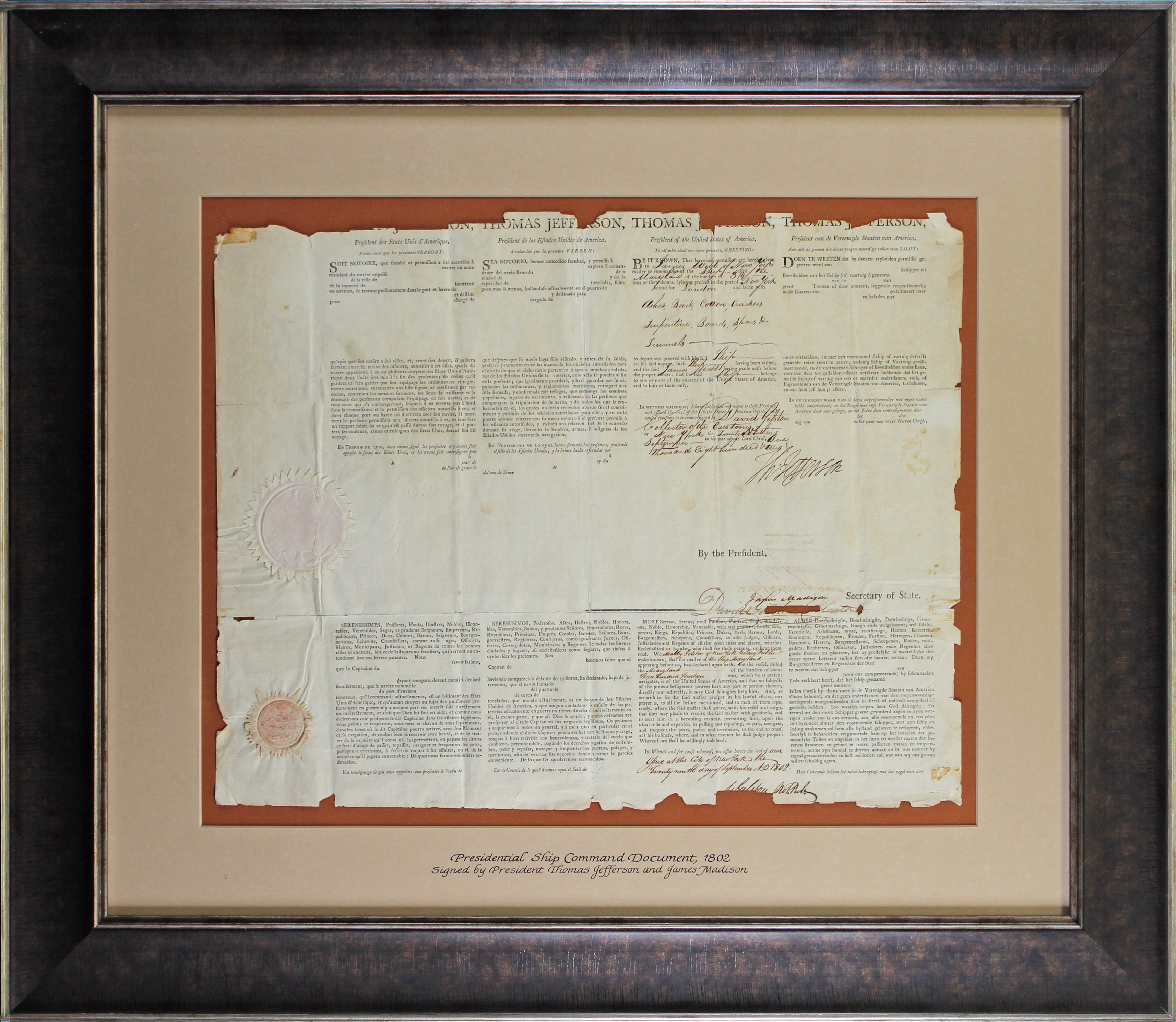 Thomas Jefferson & James Madison Signed & Framed 16x19.75 1802 Ship Passport JSA
