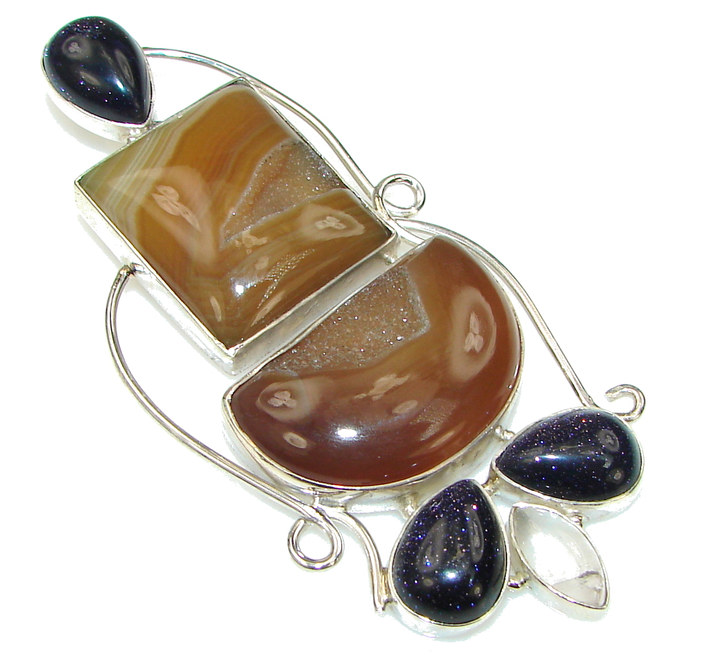 Big! Brown Secret! Agate Druzy & Blue SunSitara Sterling Silver Pendant